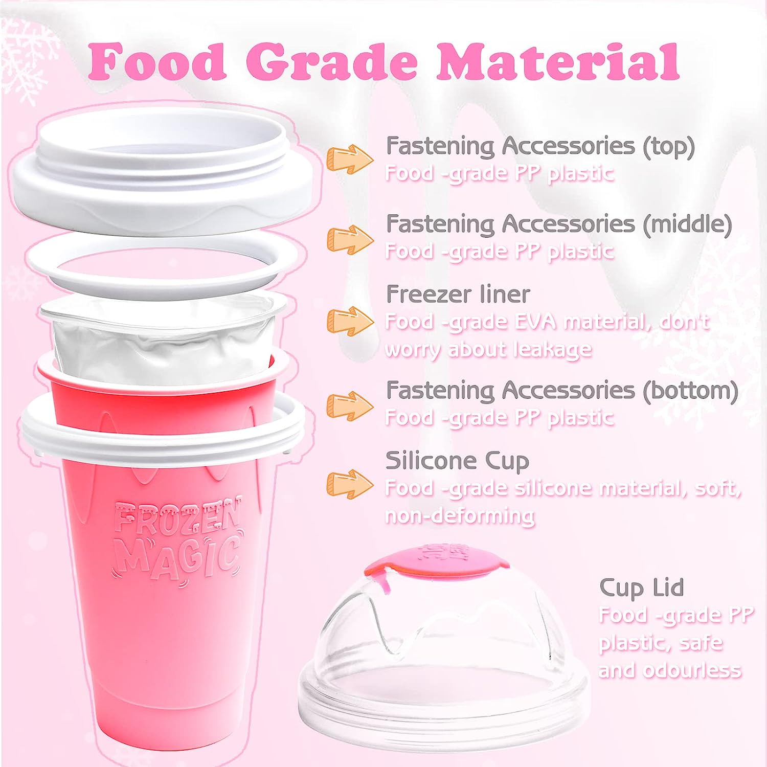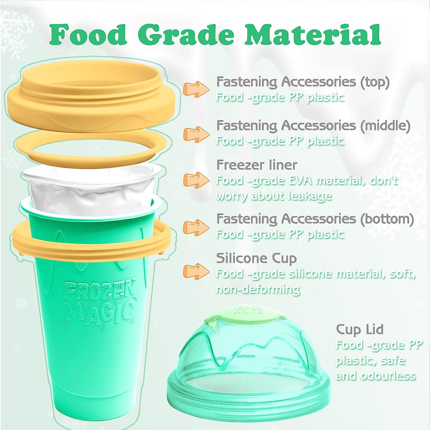 • [Absolutely Food-Grade Material] The slushy maker cup mainly consists of a silicone cup, Freezer liner, Lids and Straws, and fastening accessories. Smoothie cups are made entirely of food-grade silicone. Freezer liner is made of food-grade PVC and salt water. Fastening accessories, Lids and Straws are made of food-grade plastic.