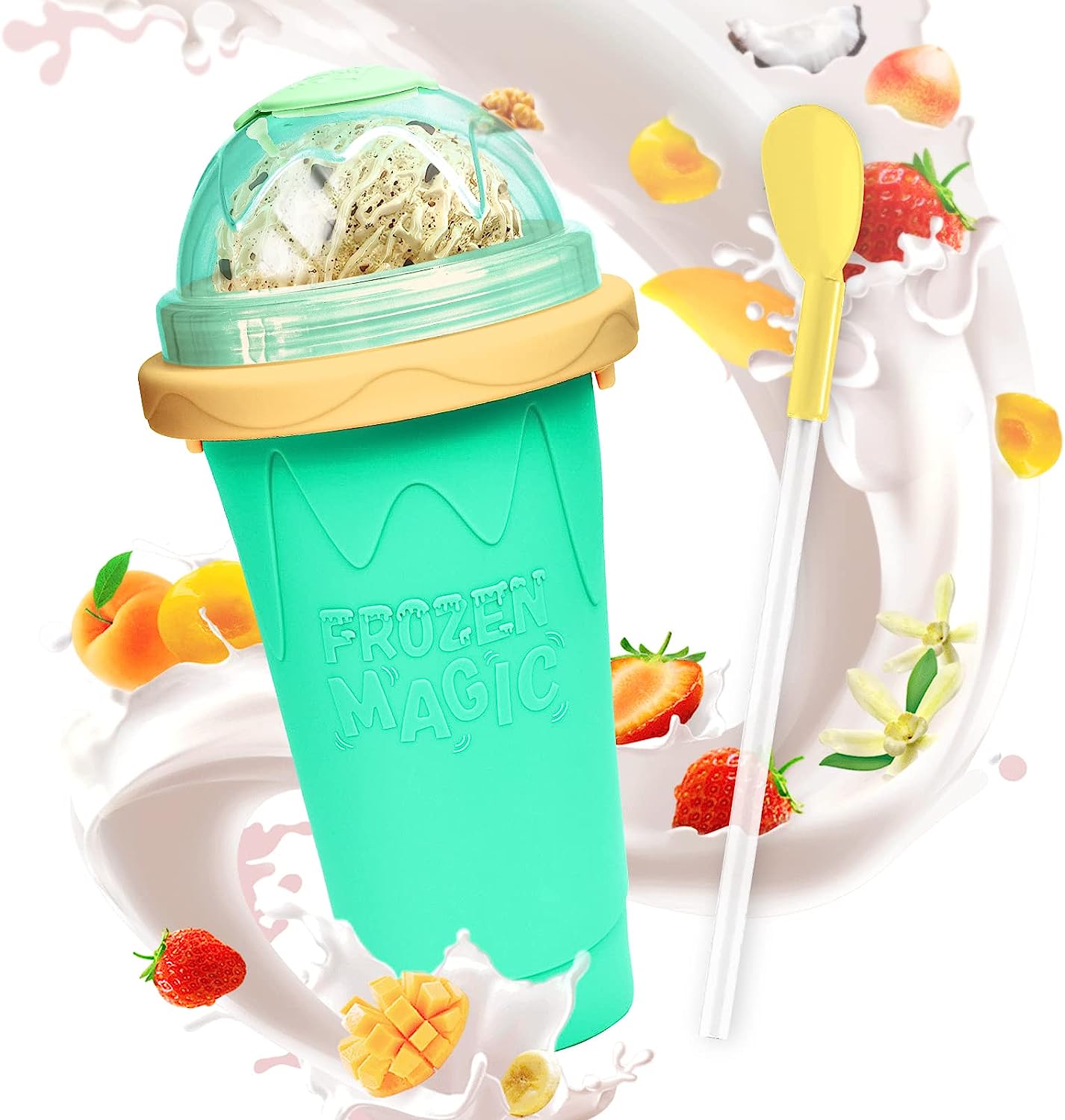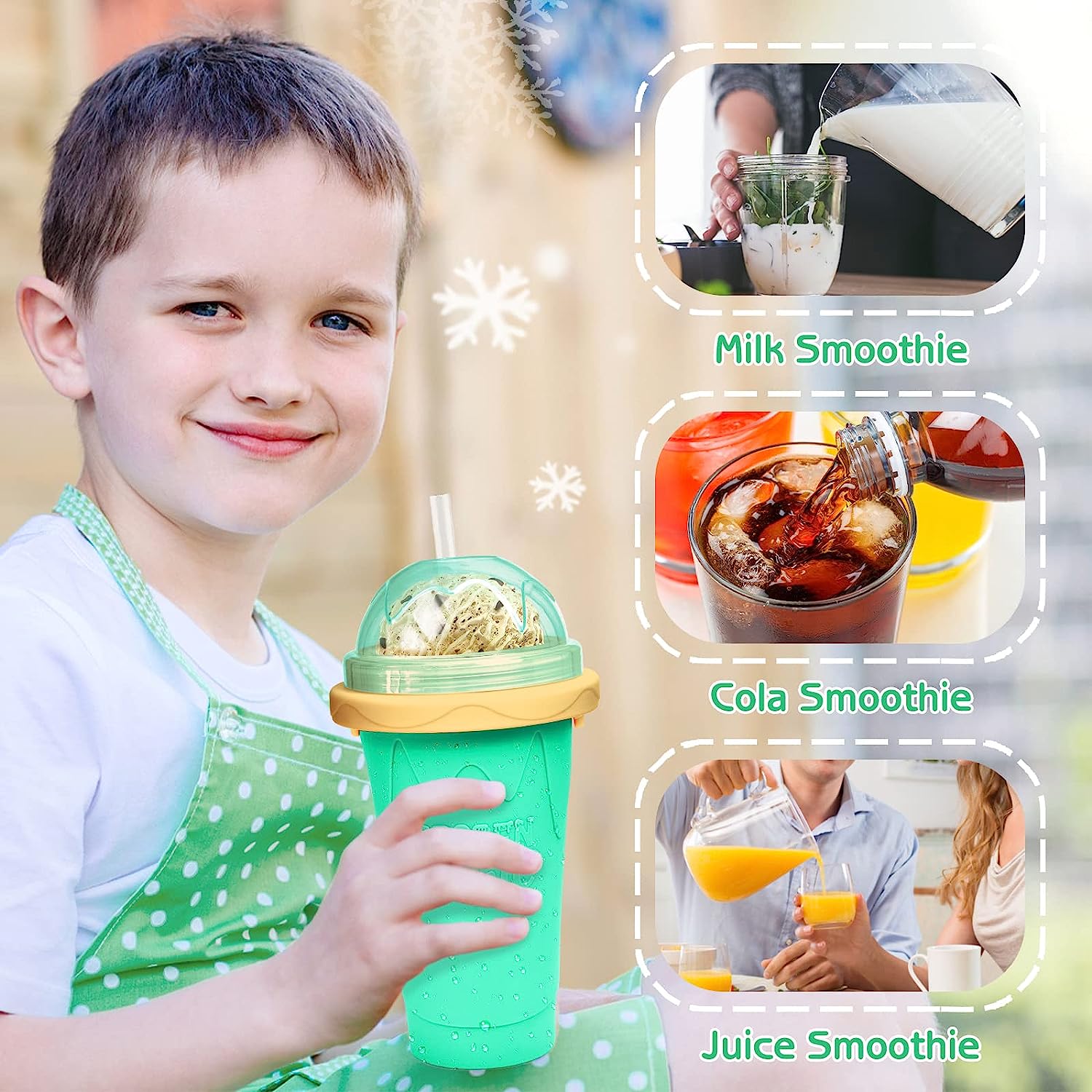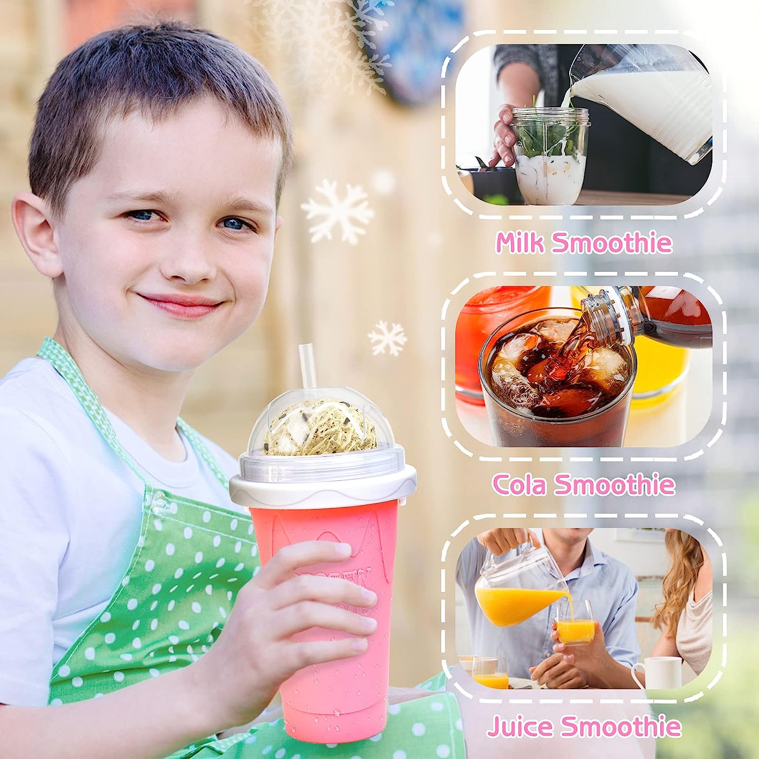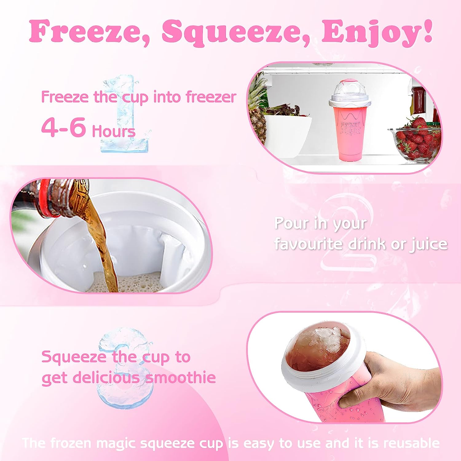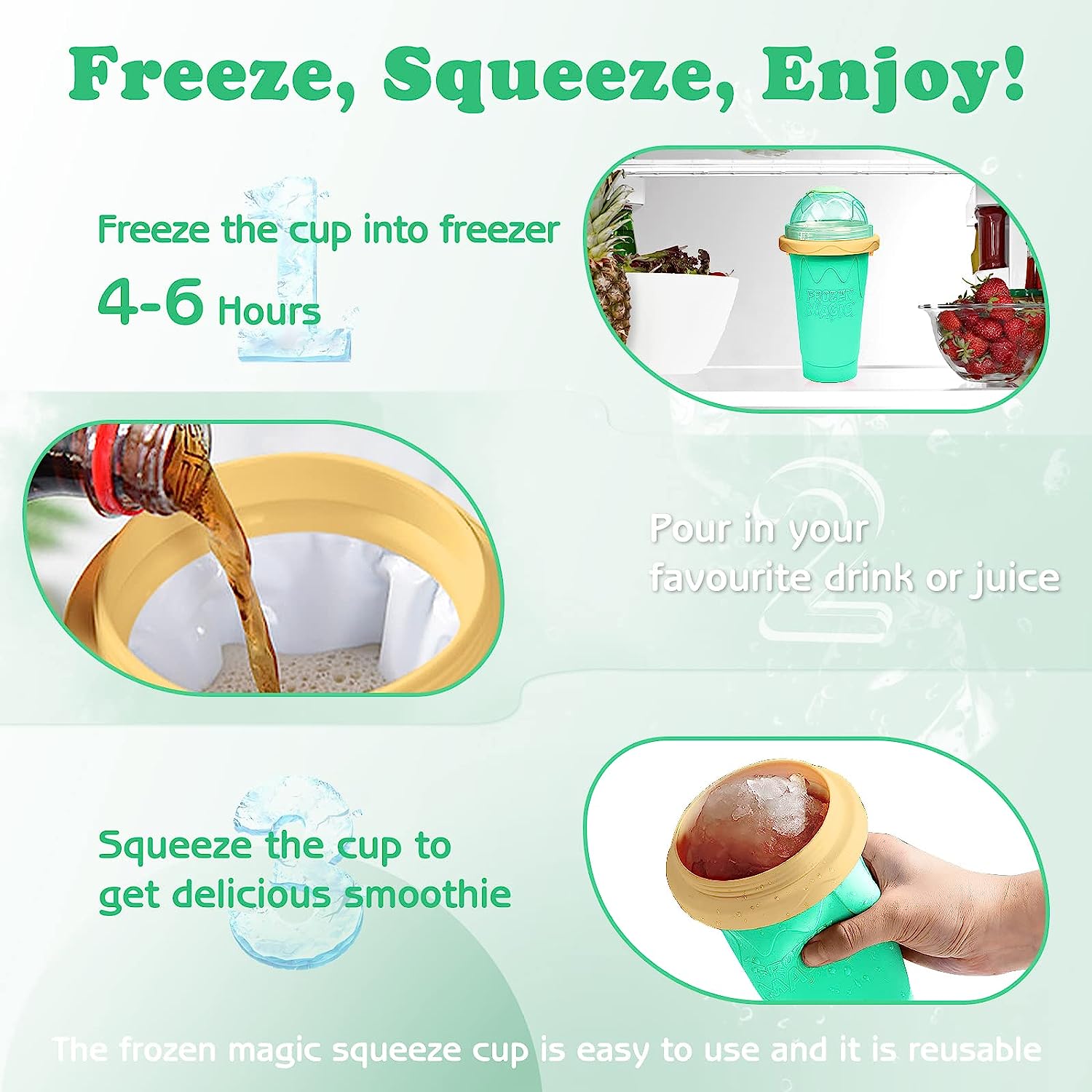• [DIY Easy to Make] 1.Freeze slushy cup. 2. Prepare chilled drinks (Juice, Cola, Beer, etc.) 3. Pour the drink into the frozen slushy cup. 4. Squeeze frozen magic slushy maker cup for 3-5 minutes. 5.Enjoy a delicious smoothie!Super simple slushie machine!
