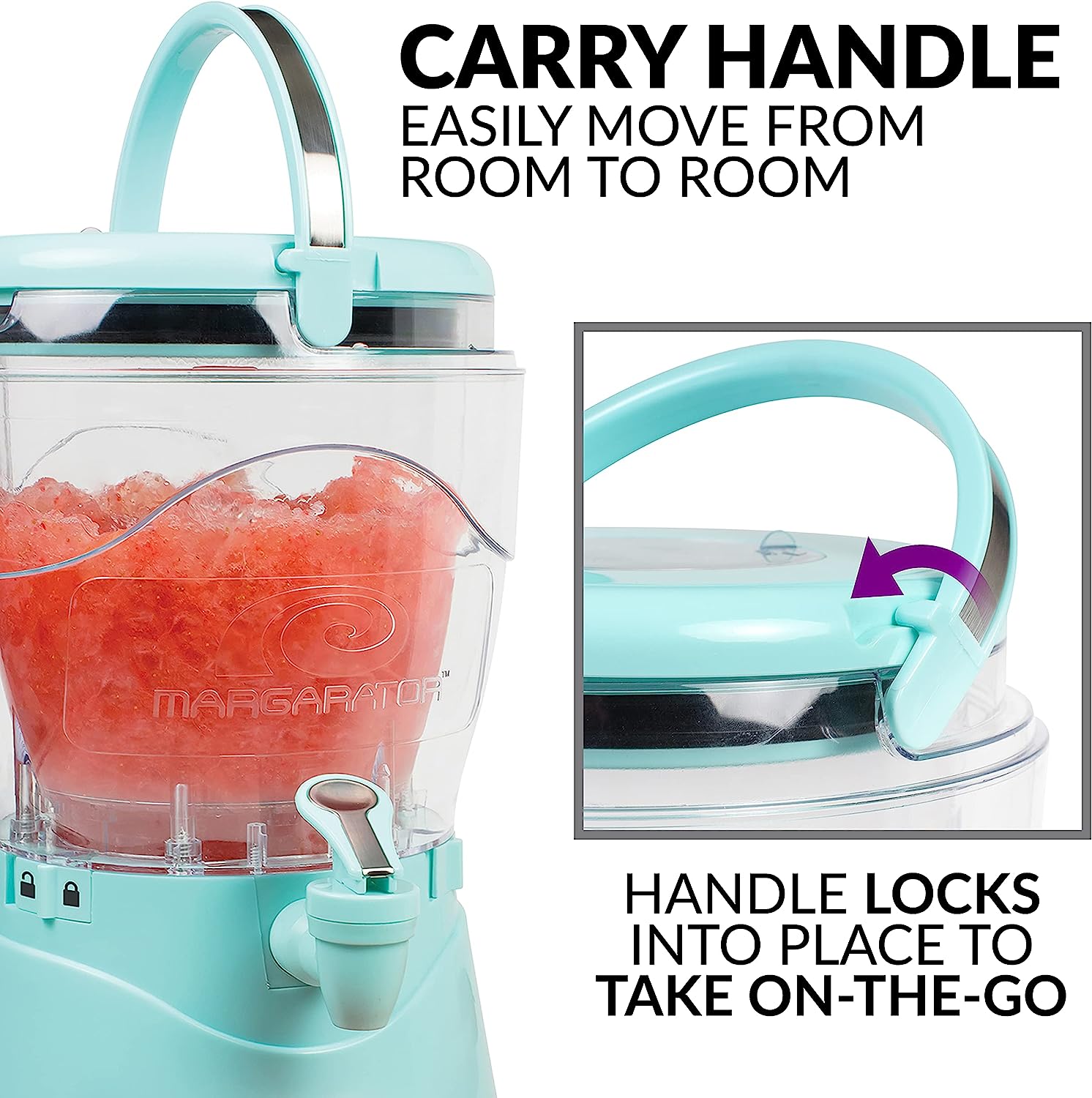 • CARRY HANDLE: Take the party to the beach, BBQ, picnic, or family gathering. This slushy machine for frozen drinks is portable and easy to lift. The handle locks and secures the lid, making it easy to move to various locations.