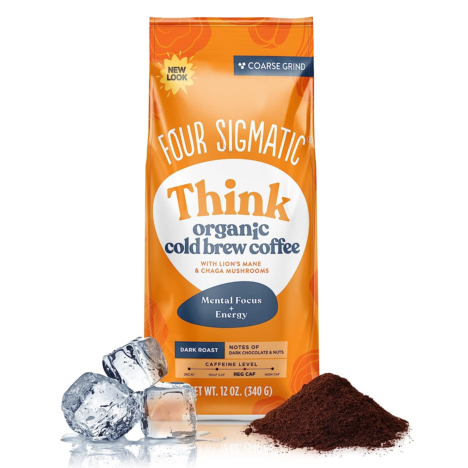 Organic Cold Brew Coffee Grounds by Four Sigmatic | Dark Roast, Fair Trade Coarse Grounds with Lion's Mane and Chaga Mushroom Extract | Cold Brew Mushroom Coffee for Crash-Free Focus | 12oz Bag