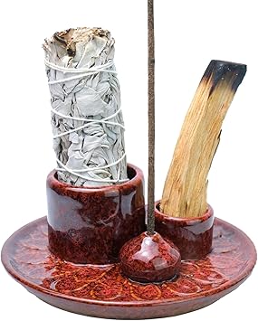 4 in 1 Incense Holder, Icense Burner for Burning Sage Smudge, palo Santo Sticks, Candle Incense Bowl, 5.12"" Ceramic Ash Catcher Tray for Meditation Zen D�©cor, Red