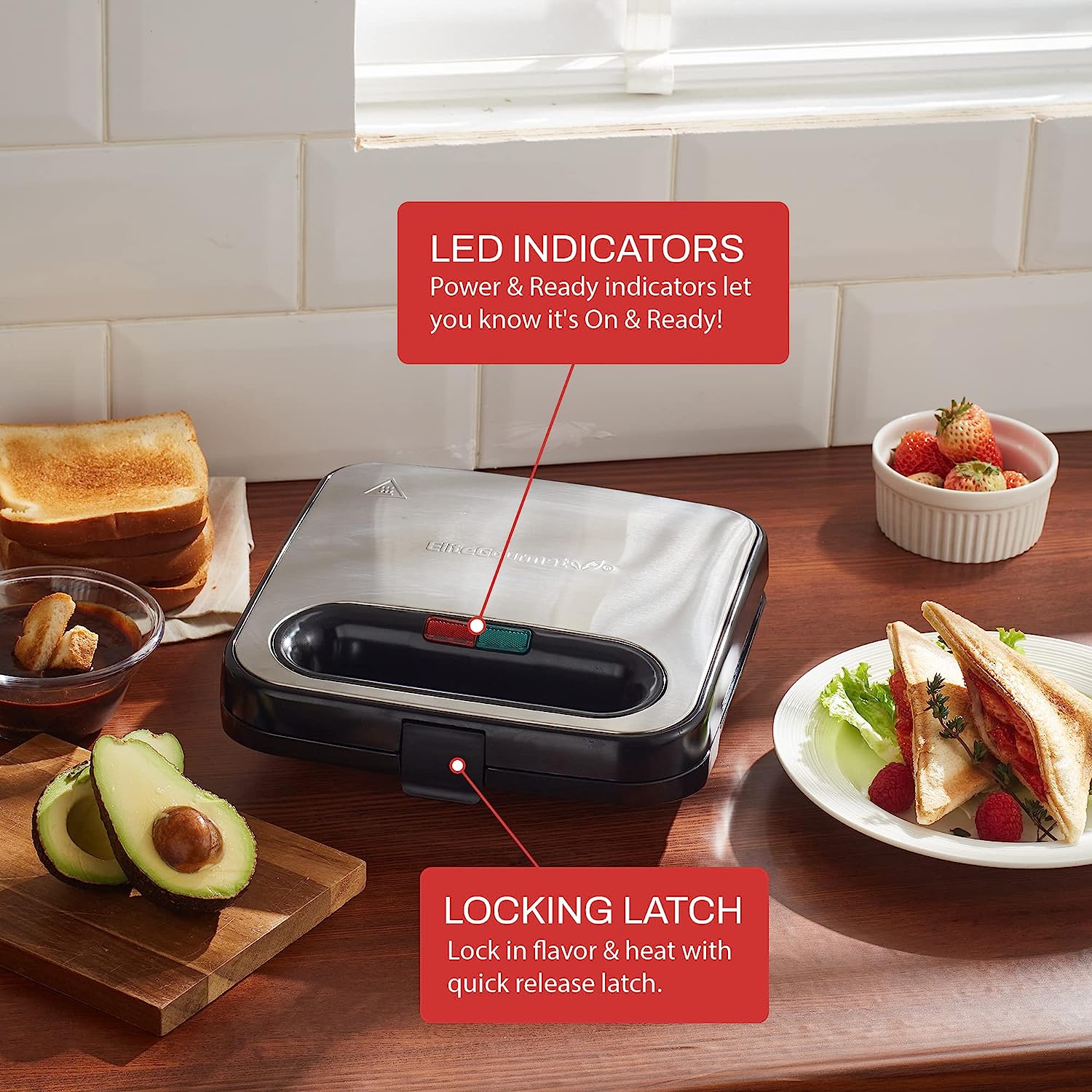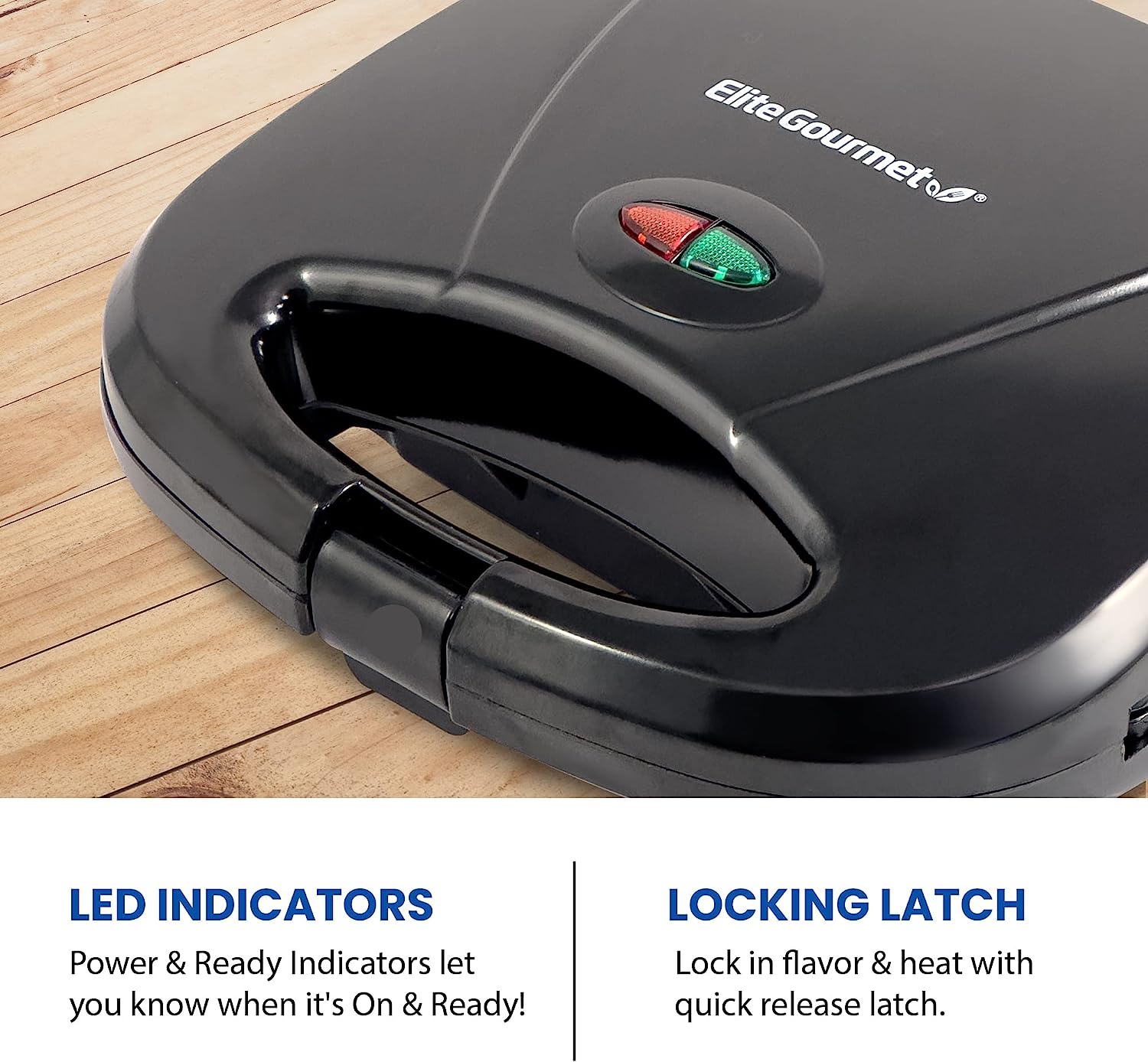 Save time in the mornings and make perfectly toasted, gourmet pressed sandwiches with the Elite Gourmet Sandwich Maker. This unique unit features easy to clean cooking plates for pressing your favorite sandwiches! The dual non-stick cooking surface saves time and makes cleaning quick and easy. Its upright design allows for easy storage and its cool-touch handle is safe to the touch. It also includes a locking latch for assured safety. Makes perfectly toasted pocket sandwiches in less than 5 minutes, start to finish!