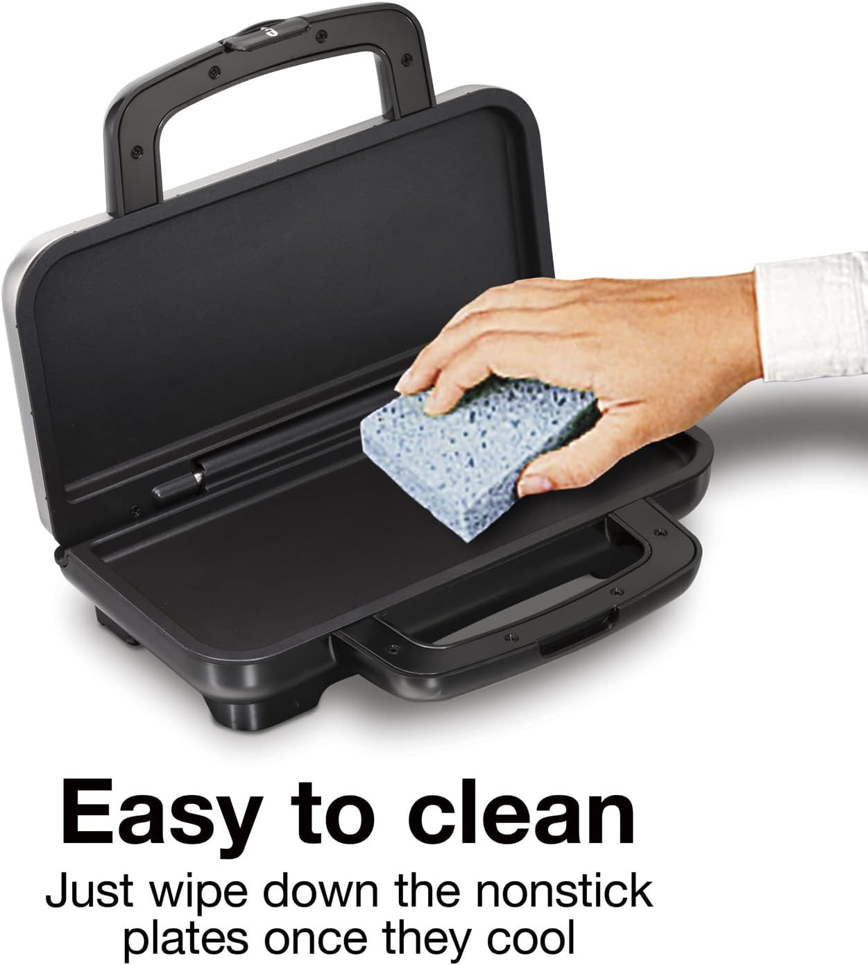 Forget the frying pan and make café-style hot sandwiches The easy way – in just 5 minutes or less. The Proctor Silex Deluxe sandwich maker heats ingredients, melts cheese and creates a crispy, golden outer crust for a satisfying meal with one easy press. Grill sandwiches up to 3 inches in thickness, from single-slice grilled cheeses to piled-high Panini's, thanks to a floating lid with lock that expertly presses down onto the bread with just the right amount of pressure. The elongated cooking surface can fit either two sandwiches or one long one at a time. Power and preheat light let you know exactly when when you're done cooking, The nonstick ceramic plates wipe down easily. It even locks and stands for compact, upright storage.