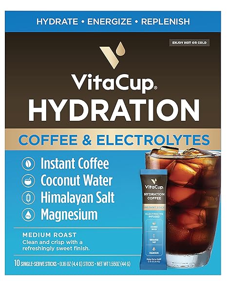 VitaCup Hydration Coffee Packets, The First Coffee That Hydrates You w/Electrolytes, Coconut Water, Pink Himalayan Salt, Magnesium, Medium Roast, Instant Coffee in Single Serve Sticks, 10 Ct