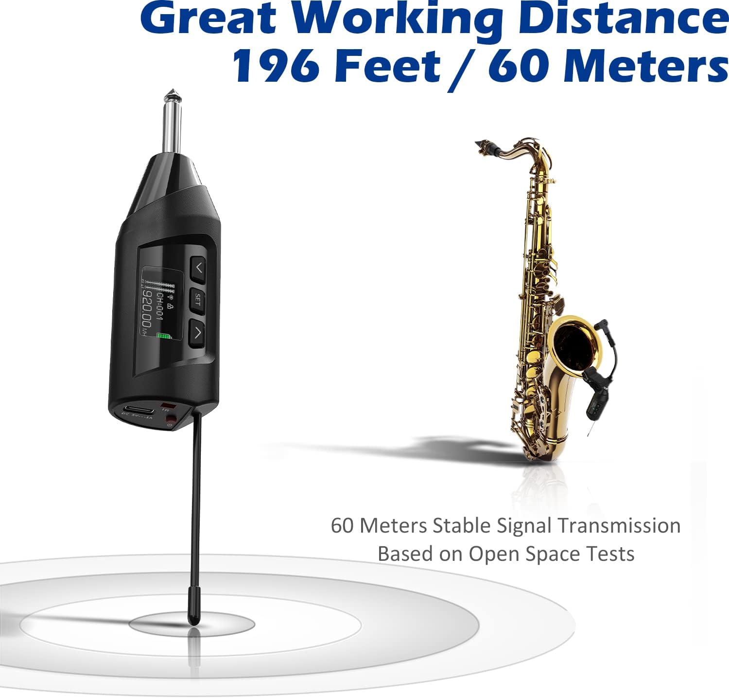 • ENJOY INTERACTION WITH AUDIENCE: The wireless sax microphone uses a digital chip circuit design to enhance stable signal transmission distance up to 196 ft (60 meters). You will focus and enjoy the freedom of performance and the interaction with your audience.