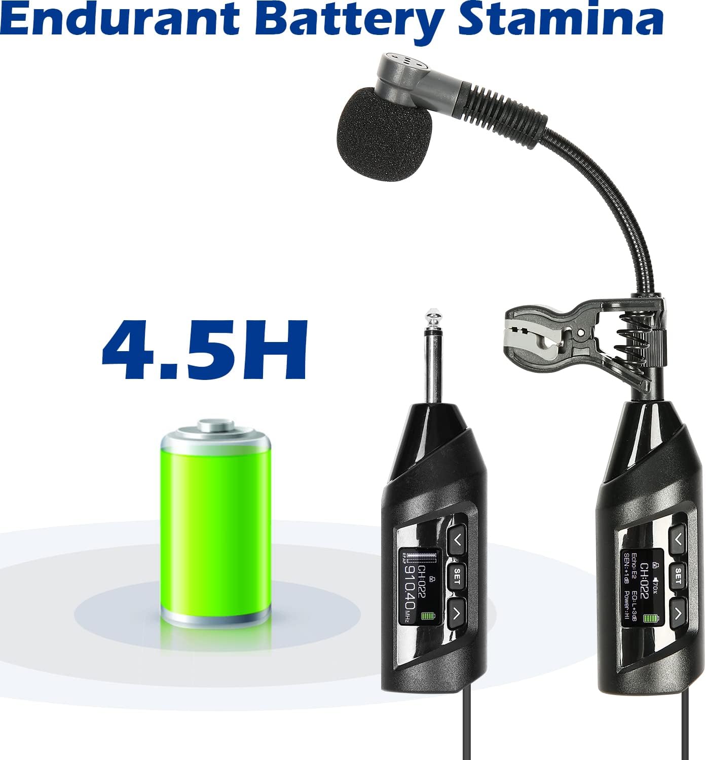 • HIGH EFFICIENT BATTERIES: The rechargeable transmitter and receiver have up to 4.5 hours of stamina when fully charged. With the included charger, you can charge both at the same time. The sax and trumpet microphone offers secure energy for your performance.