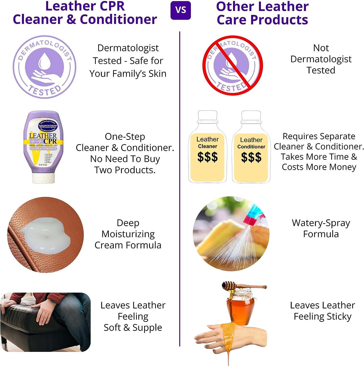 • You Deserve A Safe, Tested Leather Formula: There is a vast array of leather care products on the market, most of them made from industrial chemicals. None of them are made with 100% cosmetic ingredients found in top skin care products, or dermatologist tested like Leather CPR. Our unique formulation preserves leather beautifully—with a solution that’s gentle enough for everyone who touches it. Rest assured, both your leather items & your skin are carefully protected.