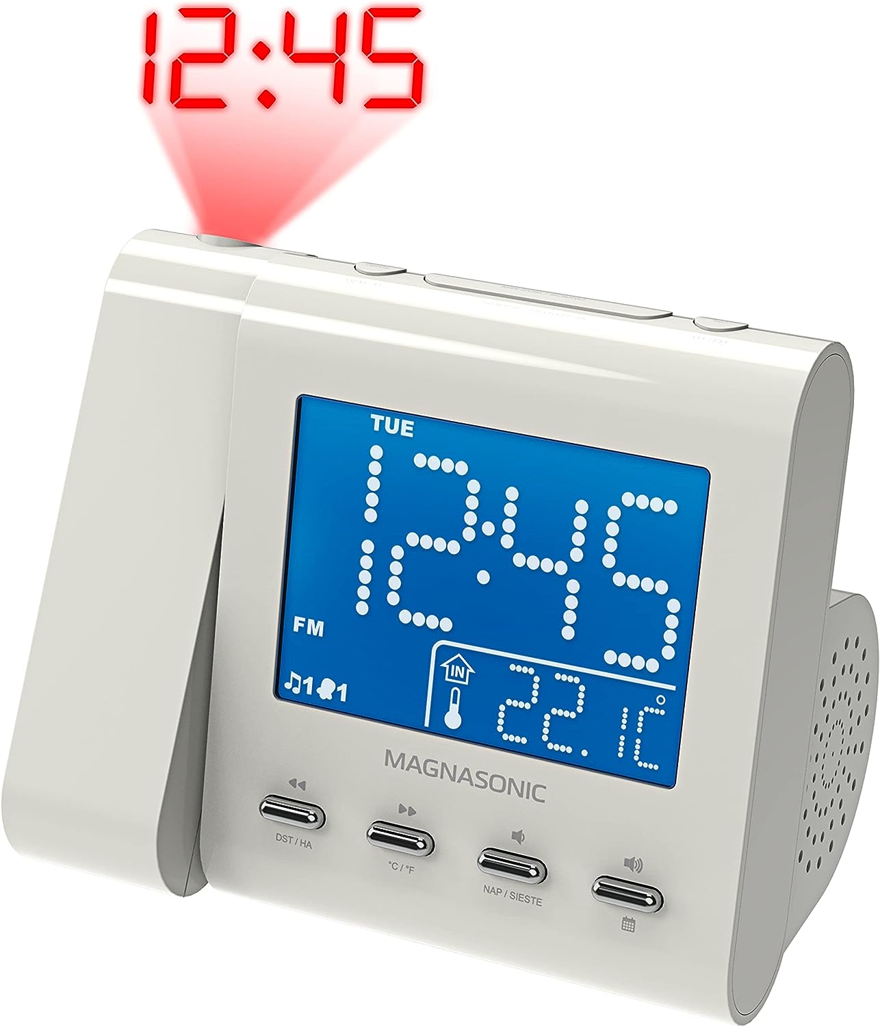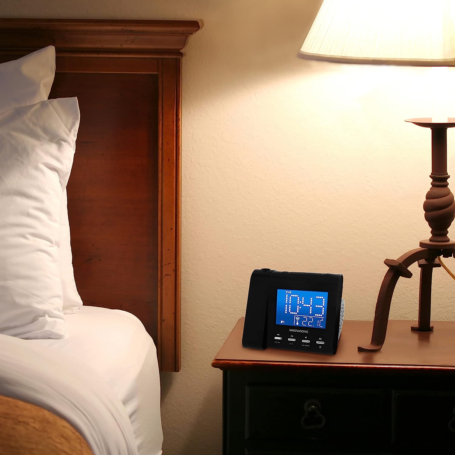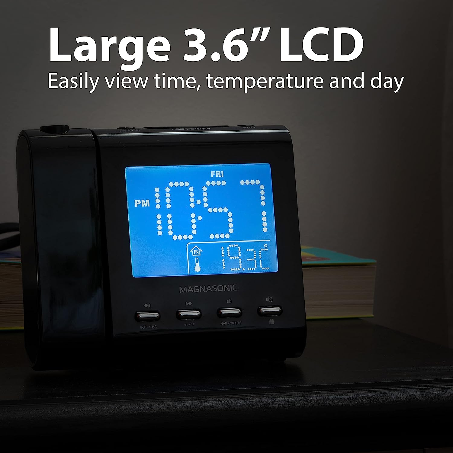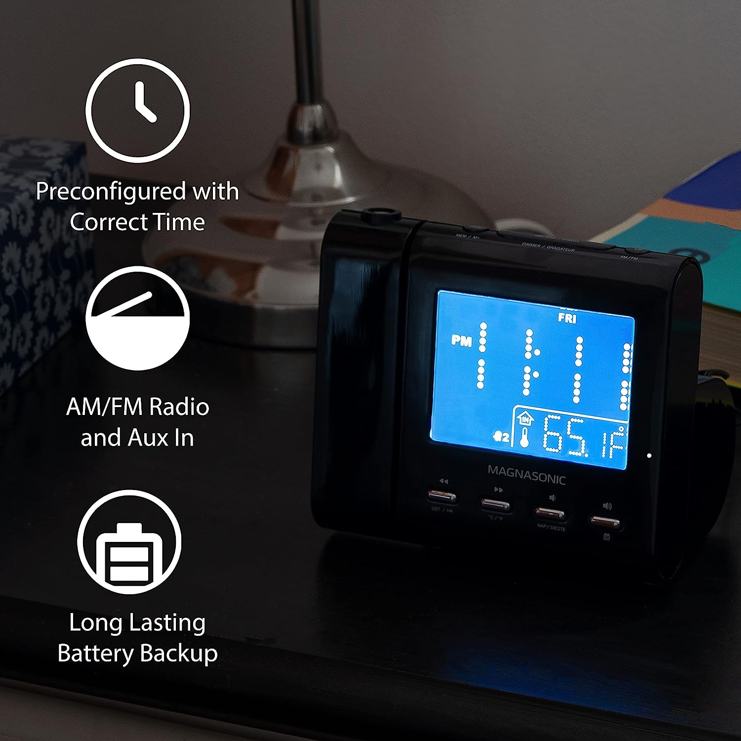 Magnasonic Projection Alarm Clock with AM/FM Radio, Battery Backup, Auto Time Set, Dual Alarm, Nap/Sleep Timer, Indoor Temperature/Date Display with Dimming & 3.5mm Audio Input - Black (EAAC601)