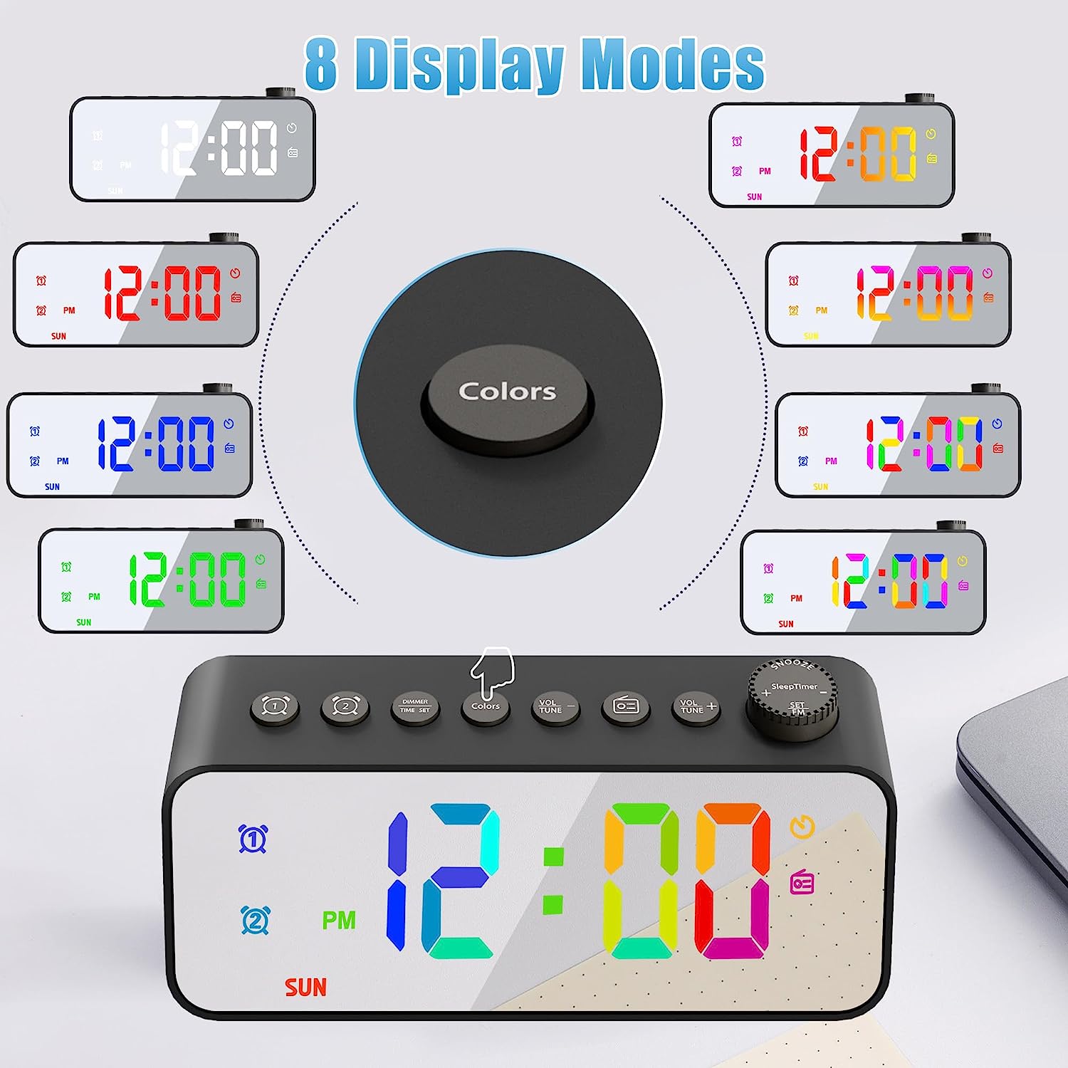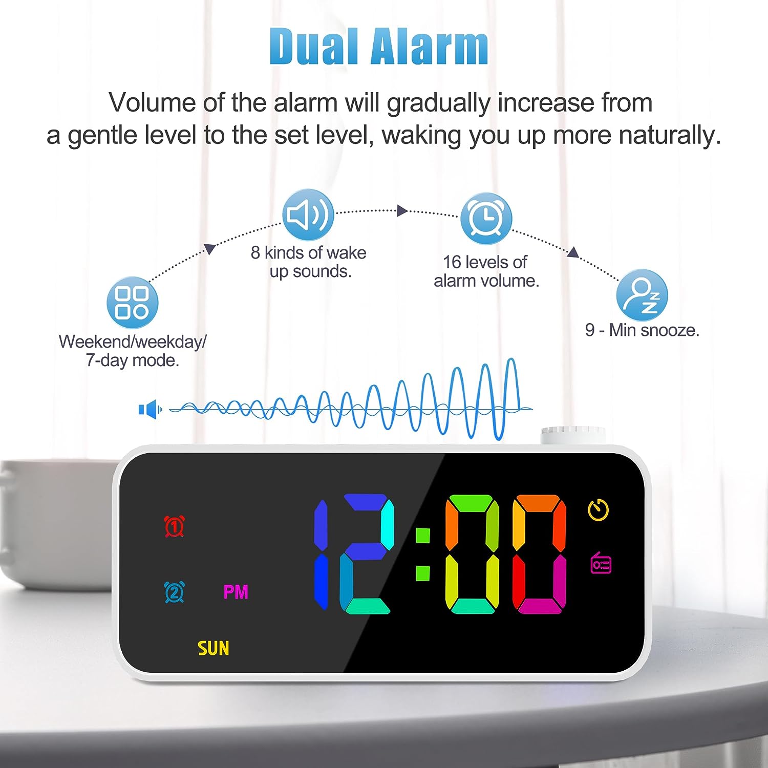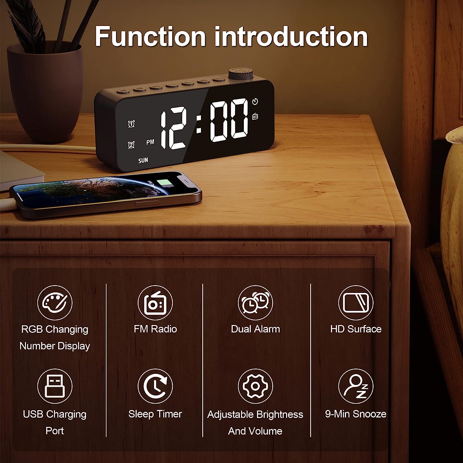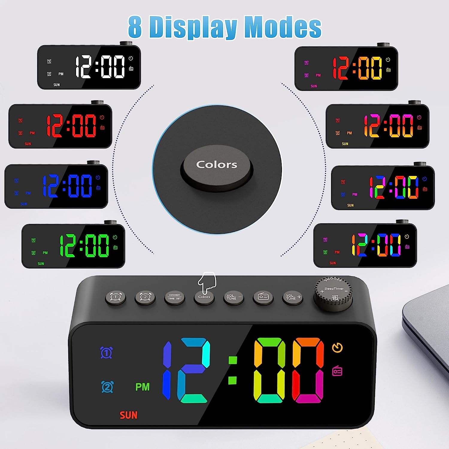 RGB Digital Alarm Clock Radio With Large Surface, Adjustable Brightness and Volume, Dual Alarm with Weekday/Weekend Mode, Snooze, FM Radio Sleep Timer, USB Charging Port, for Bedroom, Bedside(Black)