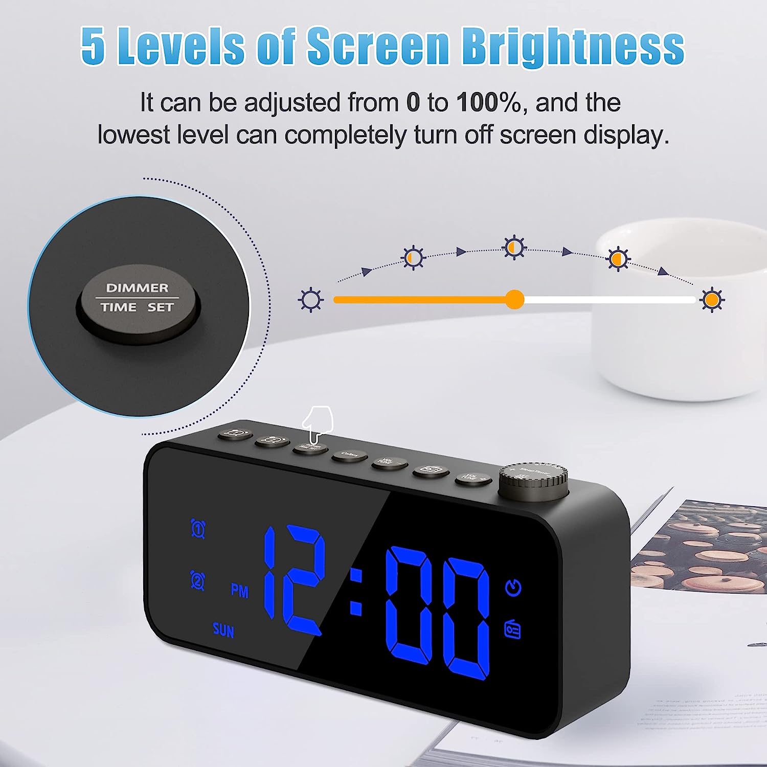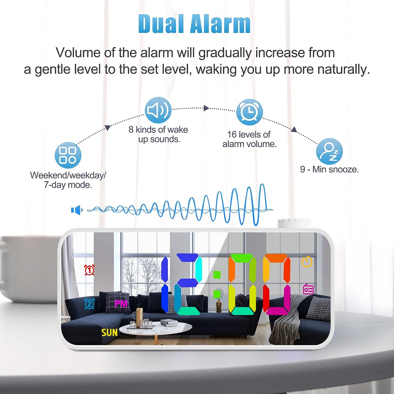 • 【Dual Alarms And Various Wake Up Sounds】 The clock offers dual alarms with separate settings for weekends, weekdays, and 7-day modes. As well as 8 wake-up sounds can be chosen(beep, ring bell, cheerful music, piano, wind chime, bird song, insect chirping, and soft music). The volume of the wake-up sound can be set to one of 16 levels and it will gradually increases from gentle to the level you set. The snooze function allows for an extra 9 minutes of sleep.