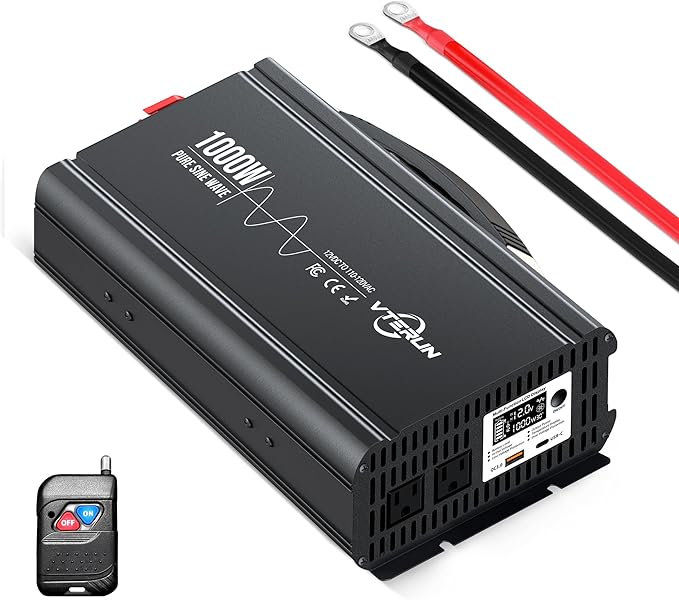 1000W Pure Sine Wave Inverter 12V DC to 110-120V AC Efficient Energy Converter for Home, RV Use with Wireless Remote Control with USB C Ports