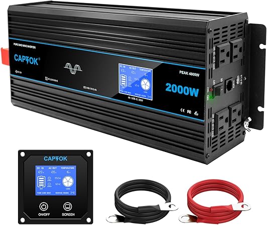 2000W Pure Sine Wave Inverter DC 12V AC 120V Double LCD Screen Remote Control Power Inverter 30W USB-C 4AC Outlets for RV, Home, Solar System