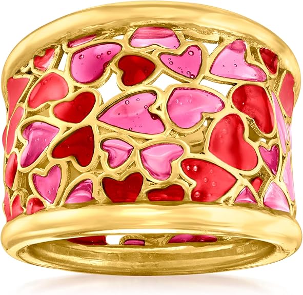 Ross-Simons Italian Red and Pink Enamel Heart Ring in 18kt Gold Over Sterling. Size 9