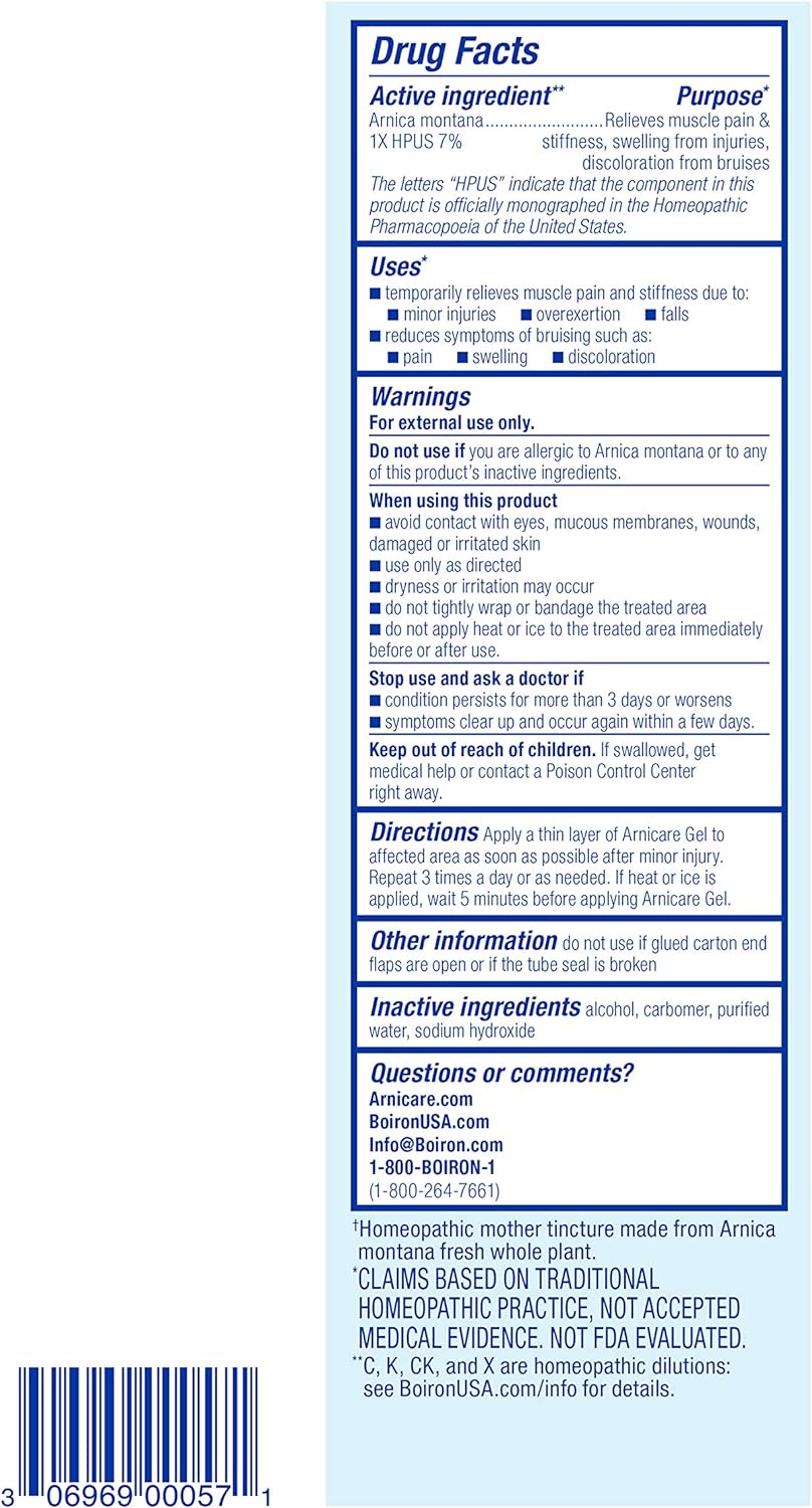 Use arnicare gel for relief of muscle aches and stiffness due to minor injuries, overexertion, falls and blows. Reduces pain, swelling and discoloration from bruises.