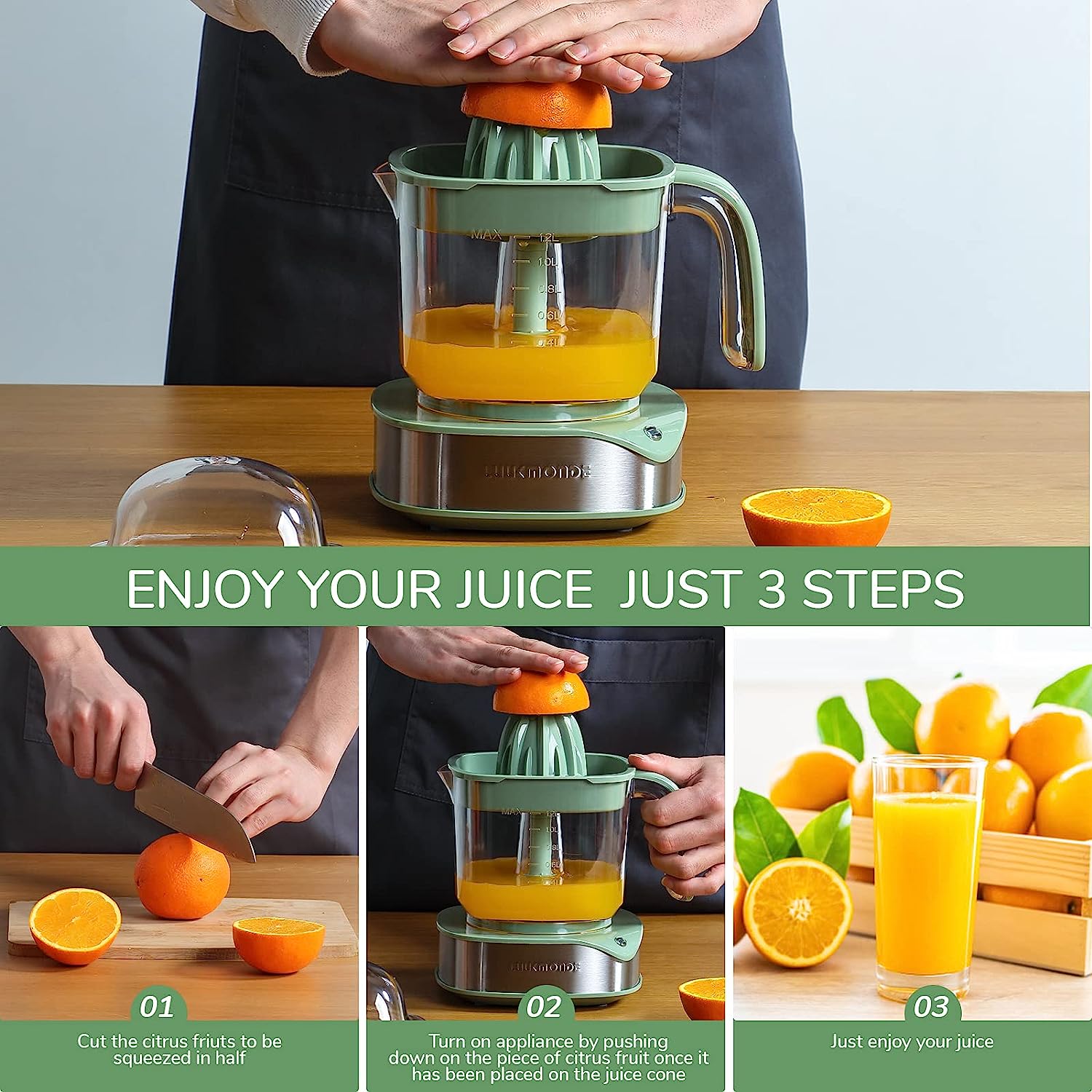 • UNIQUE DESIGN More powerful motor,professionally designed gear and large stable base make less noise and no swagging while using our orange juicer.We specially added stainless steel exterior trim and a clear indicator led light in the shape of the product.