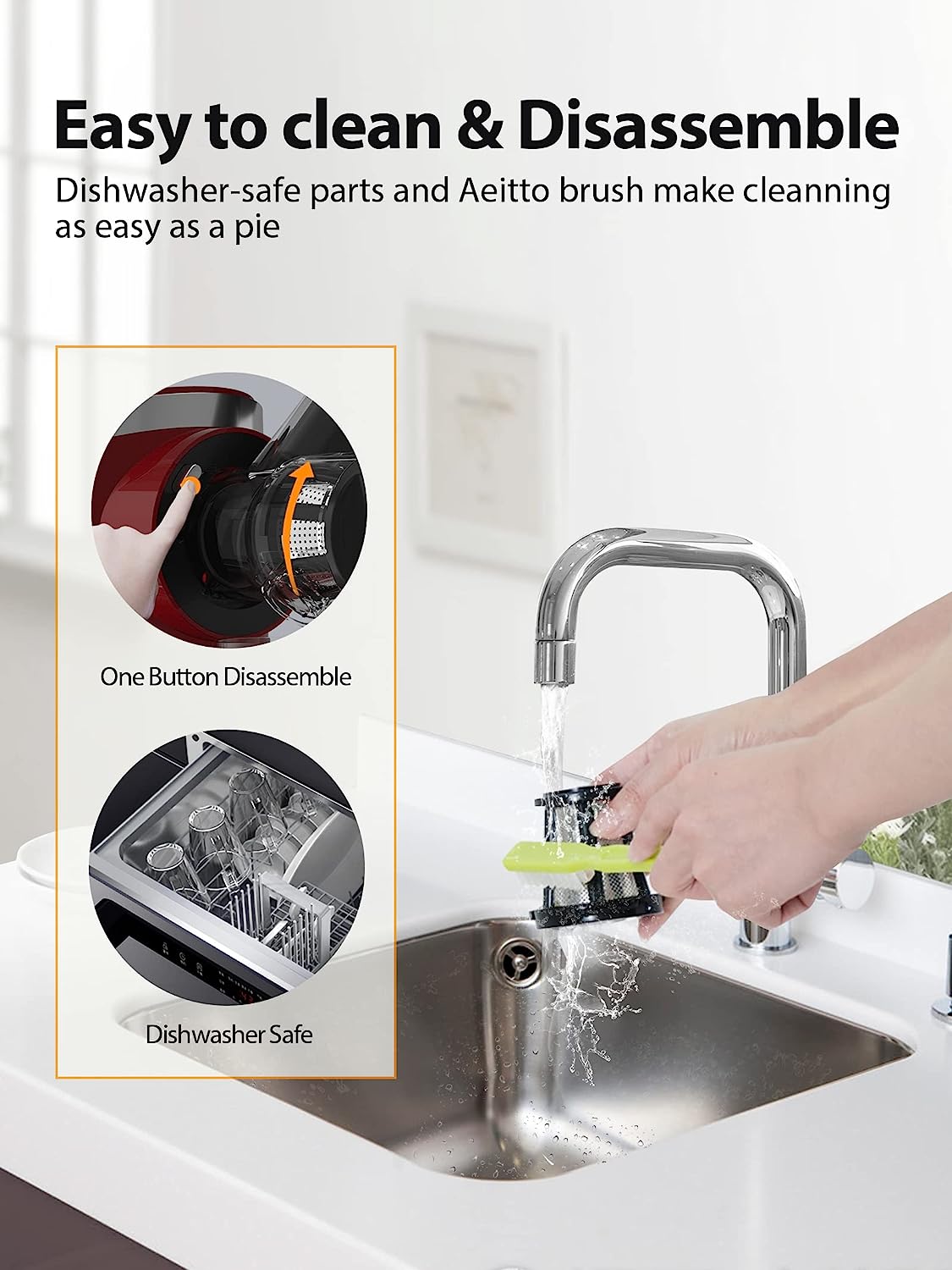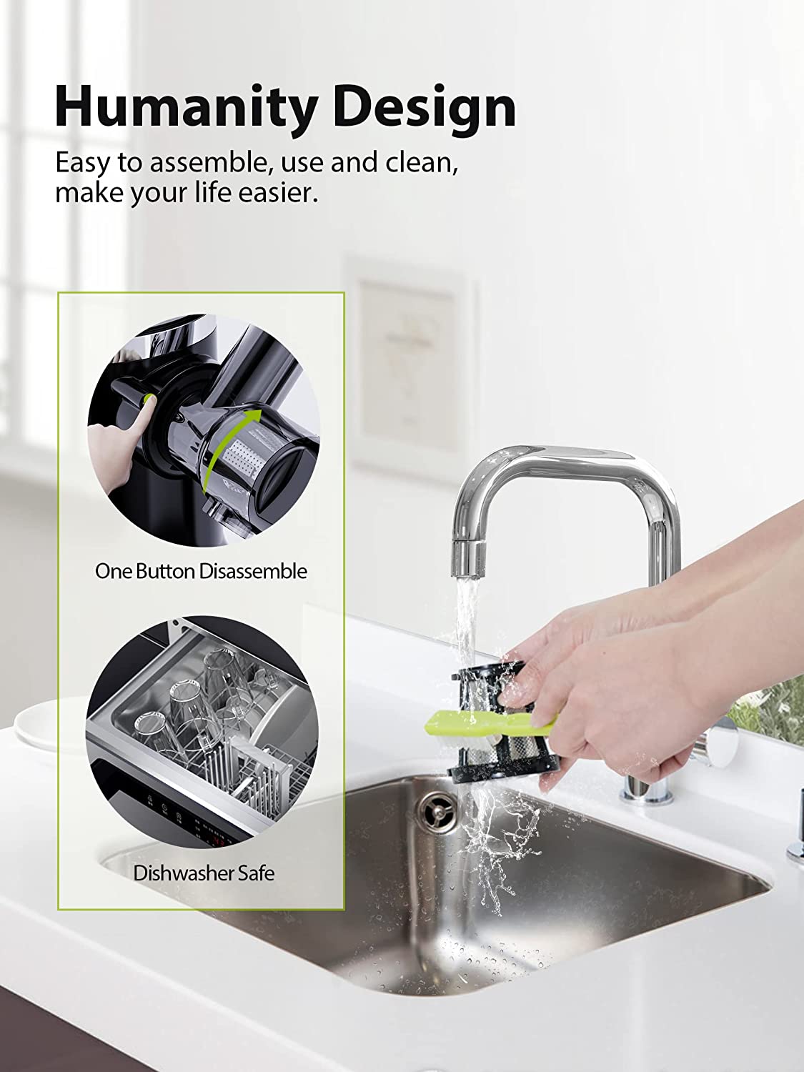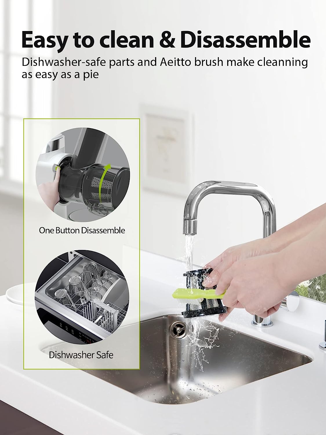 • ?【Easy to Disassemble & Clean】-The one-button disassembly design eliminates the trouble of complicated disassembly.And Aeitto juicers is equipped with a cleaning brush to make the juicers cleaner easier.The parts are dishwasher safe.