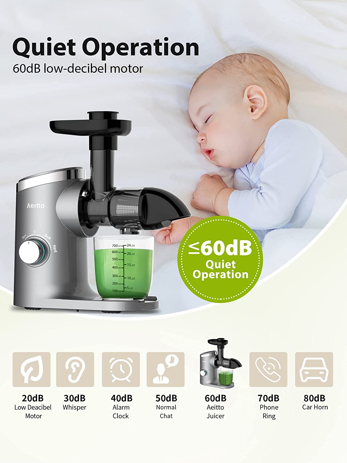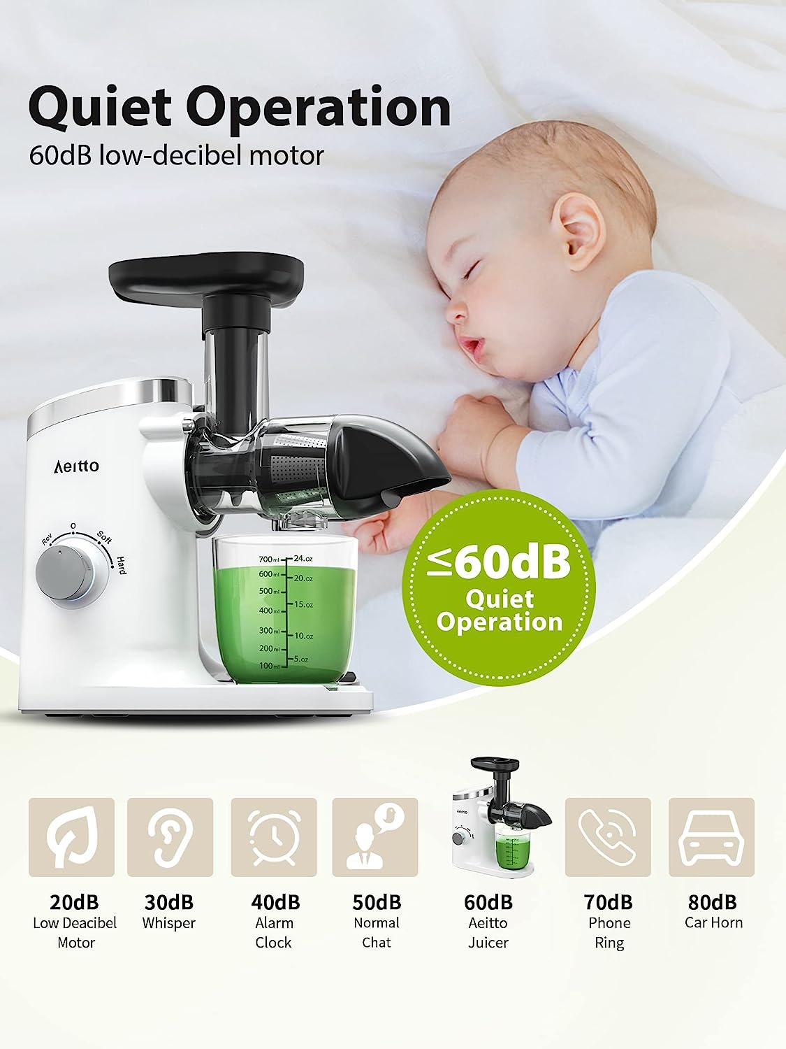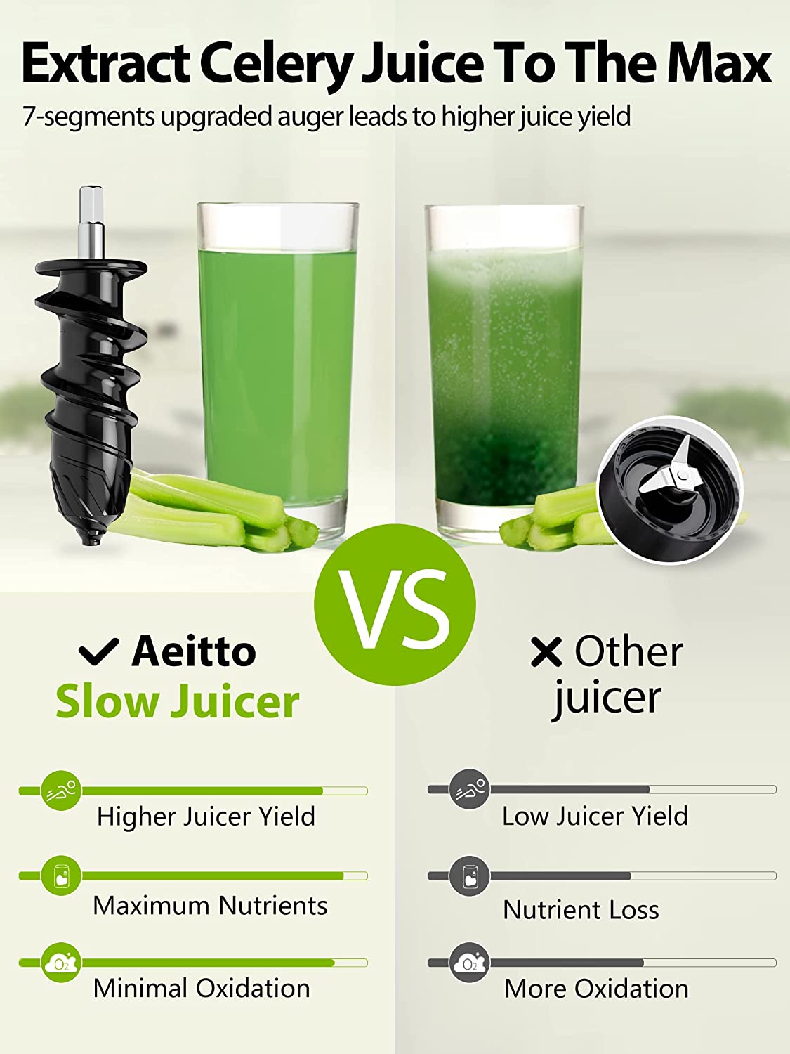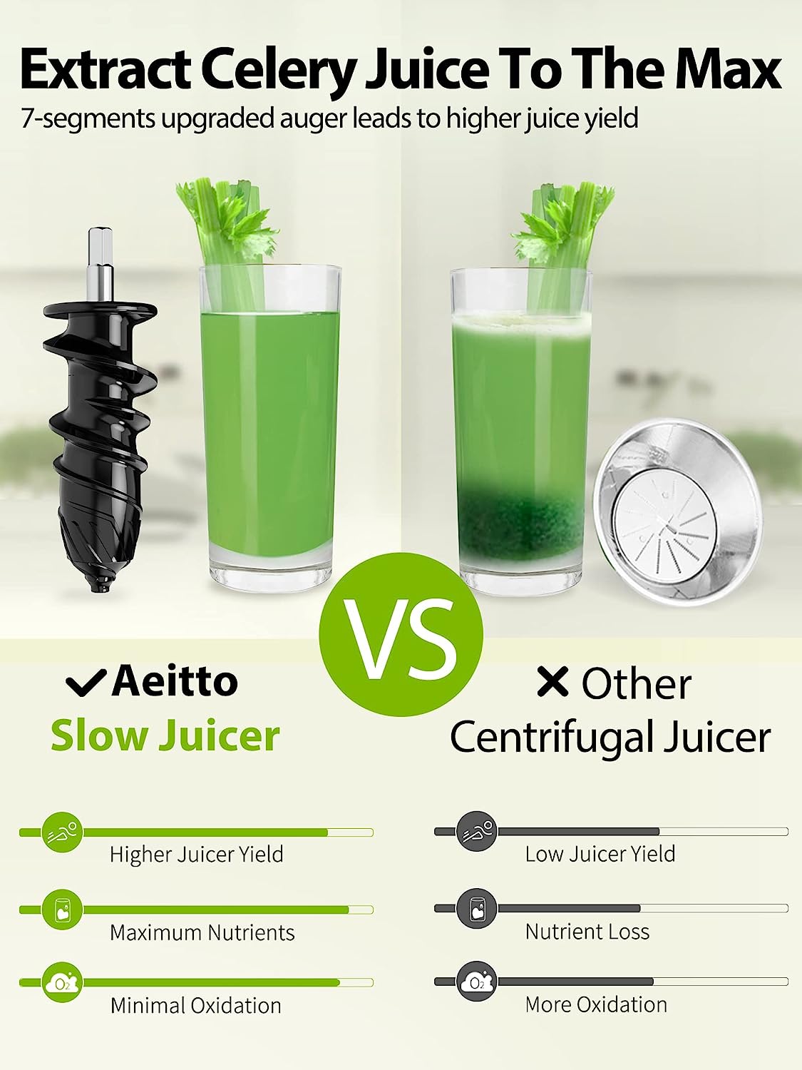 • ?【Upgraded Auger & Quiet Operation】-The upgraded auger of the Aeitto Juicer Machines can better increase juicer yield, and the juice can retain more abundant nutrients and reduce oxidation.The motor operates less than 60 decibels.It stop automatically for every 20 minutes' operation.
