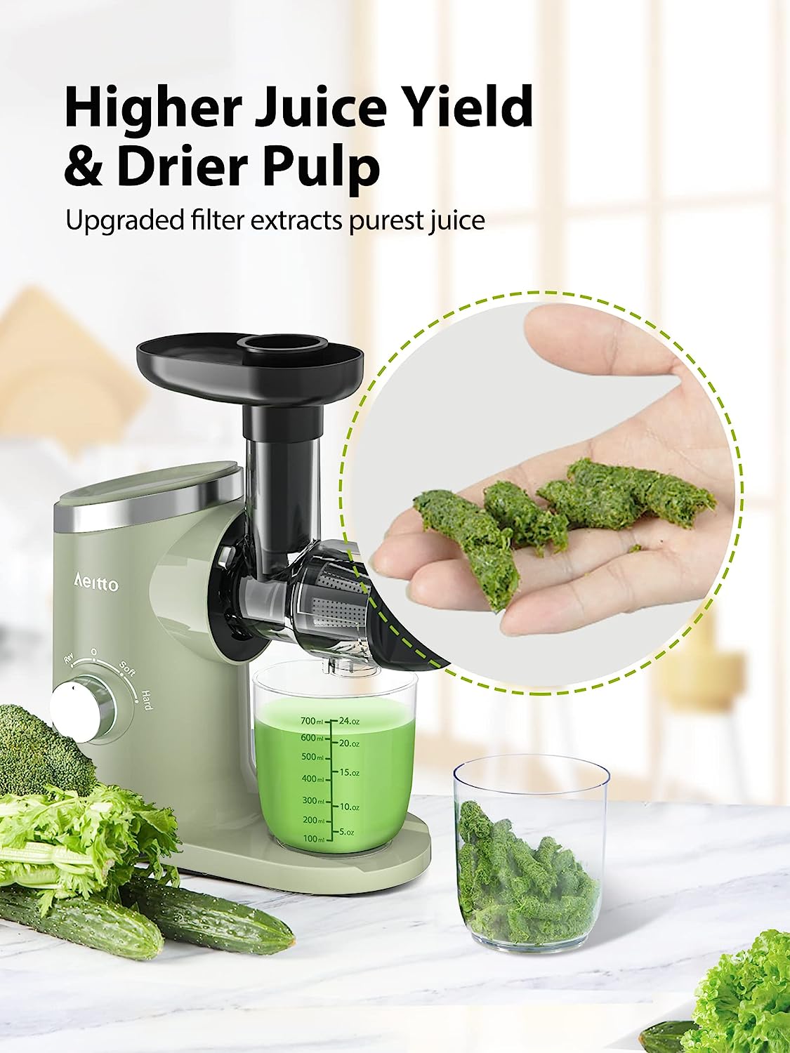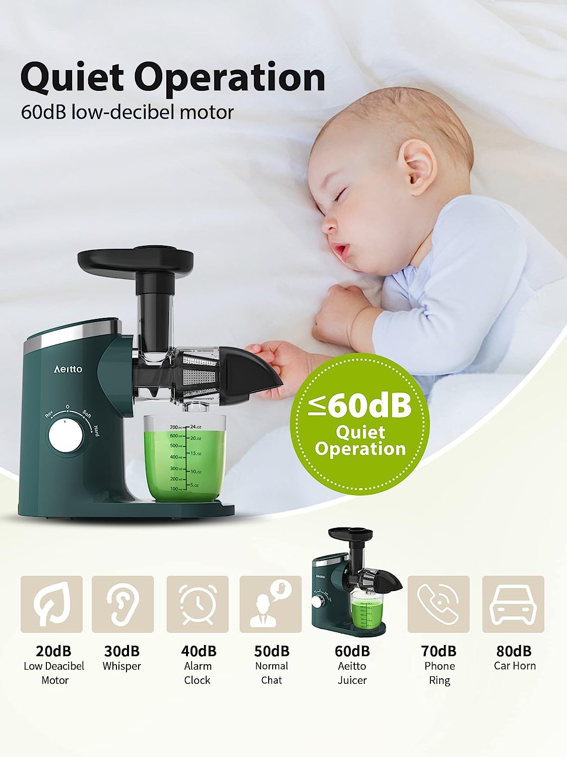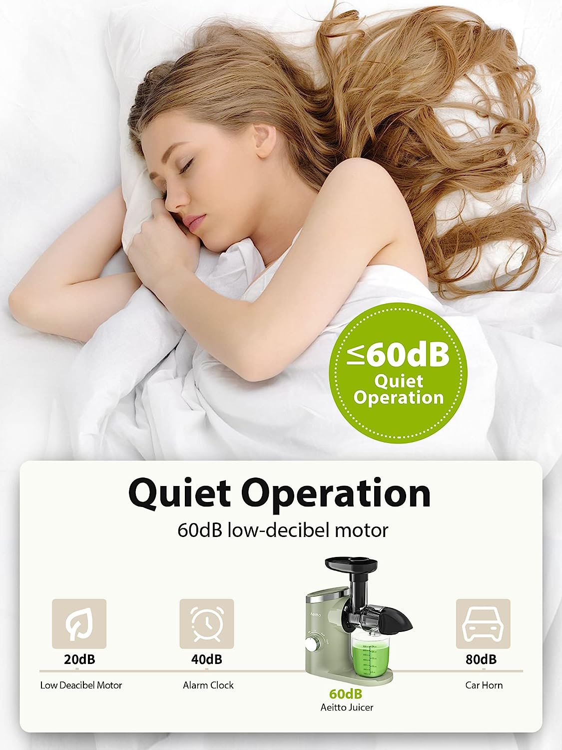 • ?【Upgraded Auger & Quiet Operation】-The upgraded auger of the Aeitto Juicer Machines can better increase juicer yield, and the juice can retain more abundant nutrients and reduce oxidation.The motor operates less than 60 decibels.It stop automatically for every 20 minutes' operation.