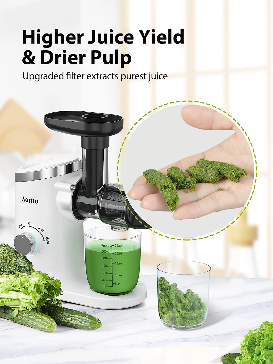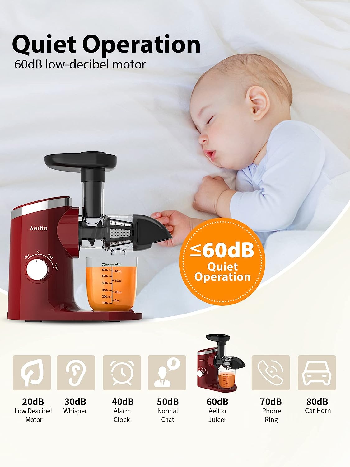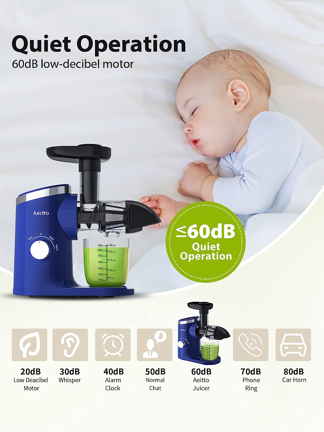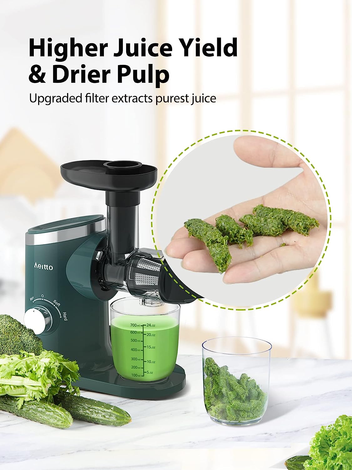 • ?【Upgraded Auger & Quiet Operation】-The upgraded auger of the Aeitto Juicer Machines can better increase juicer yield, and the juice can retain more abundant nutrients and reduce oxidation.The motor operates less than 60 decibels.It stop automatically for every 20 minutes' operation.