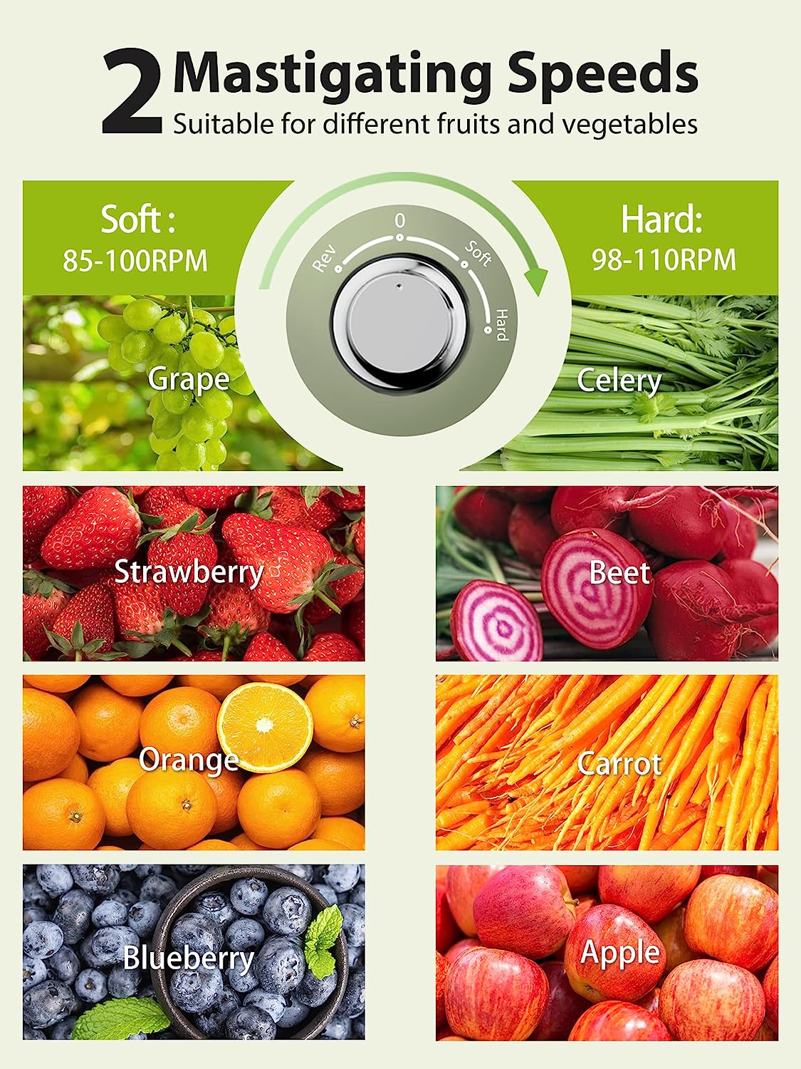 • ?【Juice & Pulp Separation and Reverse Function】-Perfectly separates the pomace from the juice,provide purest juice and vitamins for you and your family! Aeitto Cold Press Juicer provides you with a safer and quieter juice extraction environment.