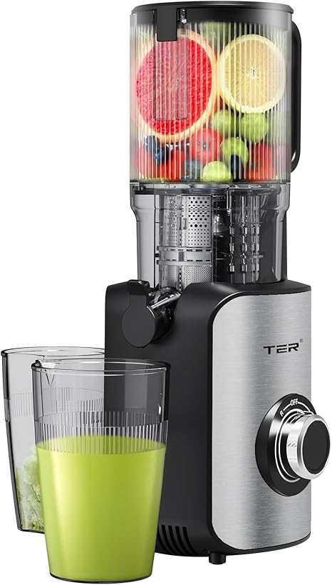 Juicer Machines, TER Cold Press Juicer with 4.72'' Wide Chute, Stainless Steel Slow Masticating for Vegetables & Fruits, High Juice Yield, Easy to Clean, Includes 2 Cups, Silver