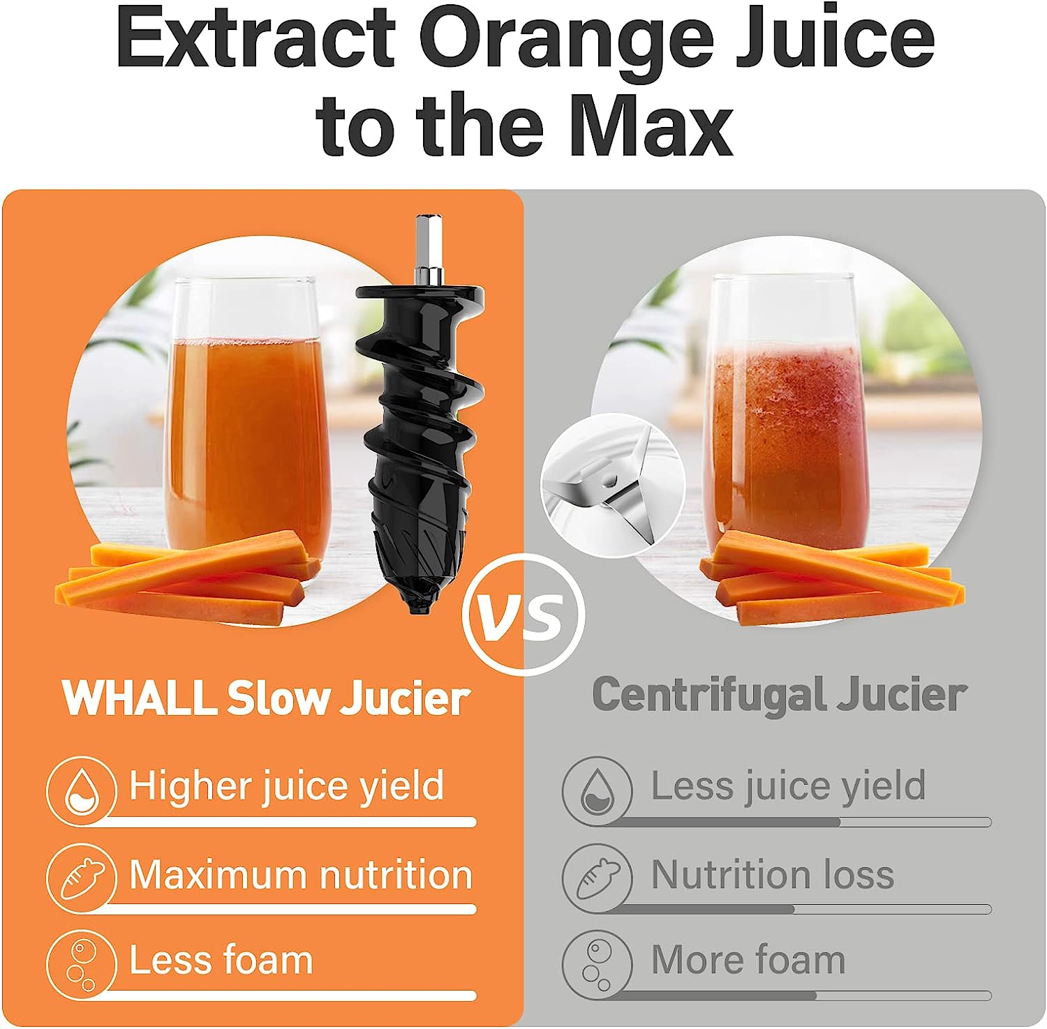 • 🍏[12-month Warranty]: WHALL Masticating Slow Juicer has one-year warranty and normal accessories exchange. Please feel free to contact us if you have any questions. We will try our best to provide satisfactory customer service.
