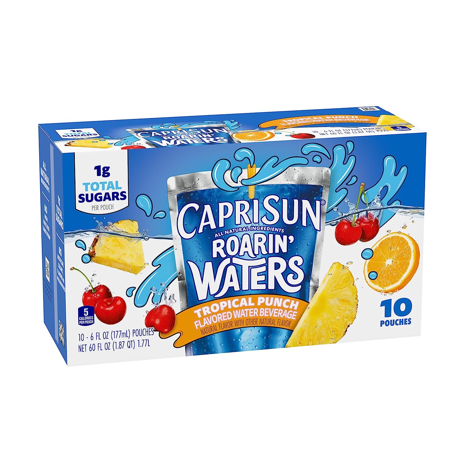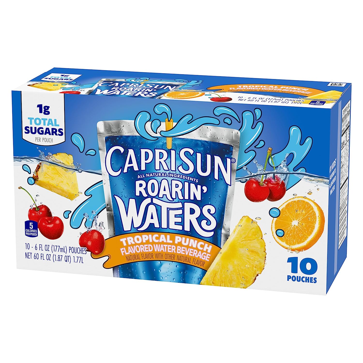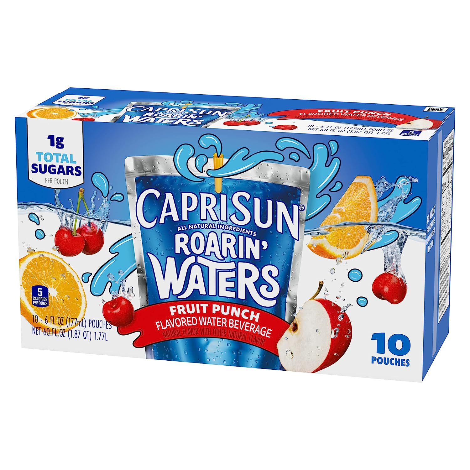 Capri Sun Roarin' Waters Naturally Flavored Fruit Punch Wave Water Beverage makes hydration easy and flavorful with a refreshing ready to drink beverage you can take anywhere. Natural fruit punch flavor adds a fruity touch to thirst-quenching water. These 10 count boxes of fruit punch naturally flavored water for kids are made without artificial colors, flavors or preservatives and no high fructose corn syrup, so you can feel good about serving it to your family. Each 6 fluid ounce drink pouch contains 50% less sugar than the average leading fruit juices (per 6 fluid ounces, this product has 8 grams of sugar; fruit juices 20 grams of sugar). Capri Sun makes it easy to take this berry drink along on all your adventures.