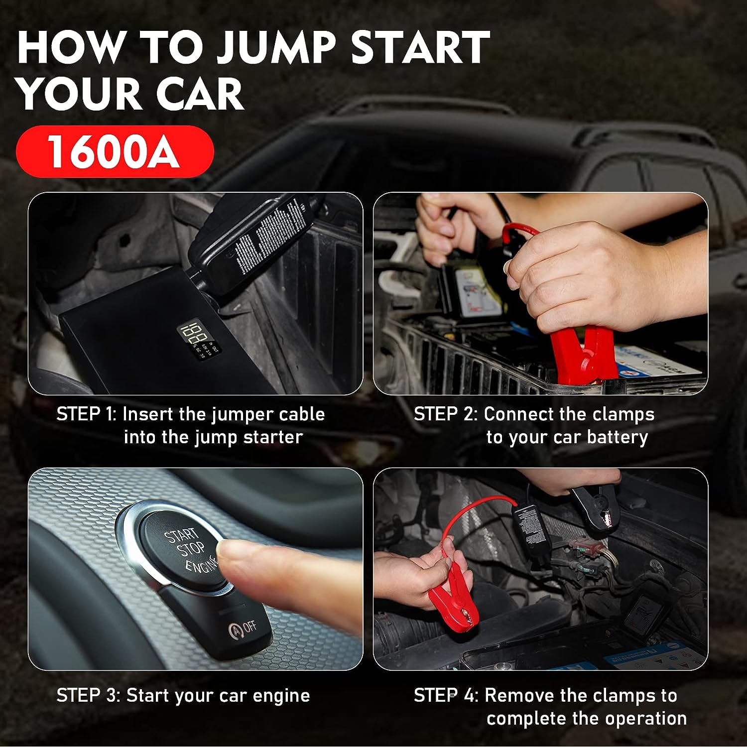 • 🚗【Intelligent Protection】 - Product status is intuitively shown on a 1.3 x 0.6 inch smart screen, so you can start your car easily, Smart jumper clamps of 12v battery jump packs with safety protection including Short Circuit Protection, Over-current Protection, Reverse Polarity Protection, Over-voltage Protection, Overcharge Protection, Spark-proof Protection, Overload Protection, Over-temperature Protection, can effectively keep your battery and vehicles away from danger.
