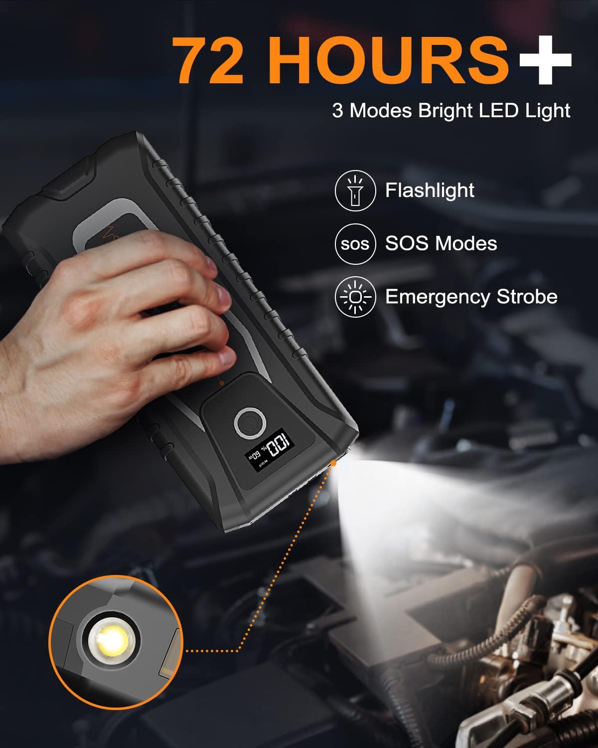 • 26800mAh Portable Charger: The jump starter battery pack is the ultimate high capacity portable charger. Equipped with dual USB charging output ports (one supports fast charging) and a USB Type-C charging port (5V/3A), it provides versatile charging options for all your devices. including smartphone, tablet, camera, GPS system, or any other portable device, our jump starter has got you covered. It even has the ability to recharge itself, ensuring you always have power on the go.