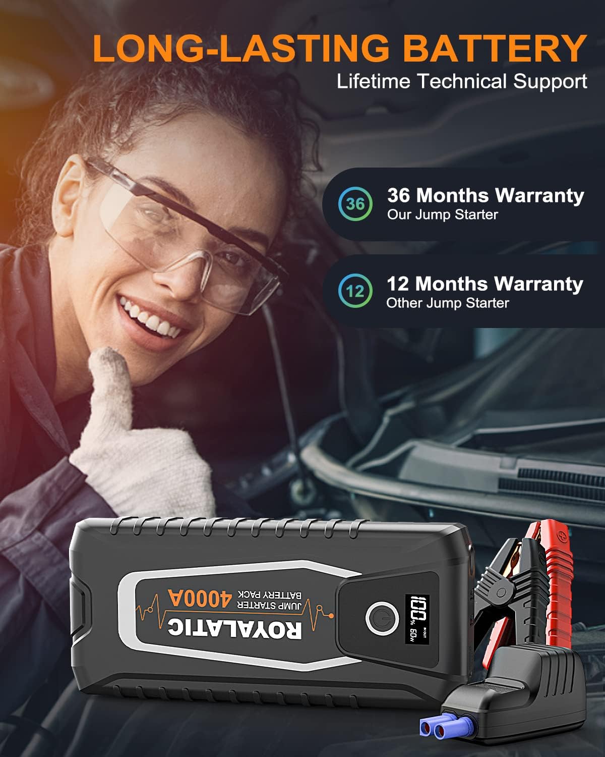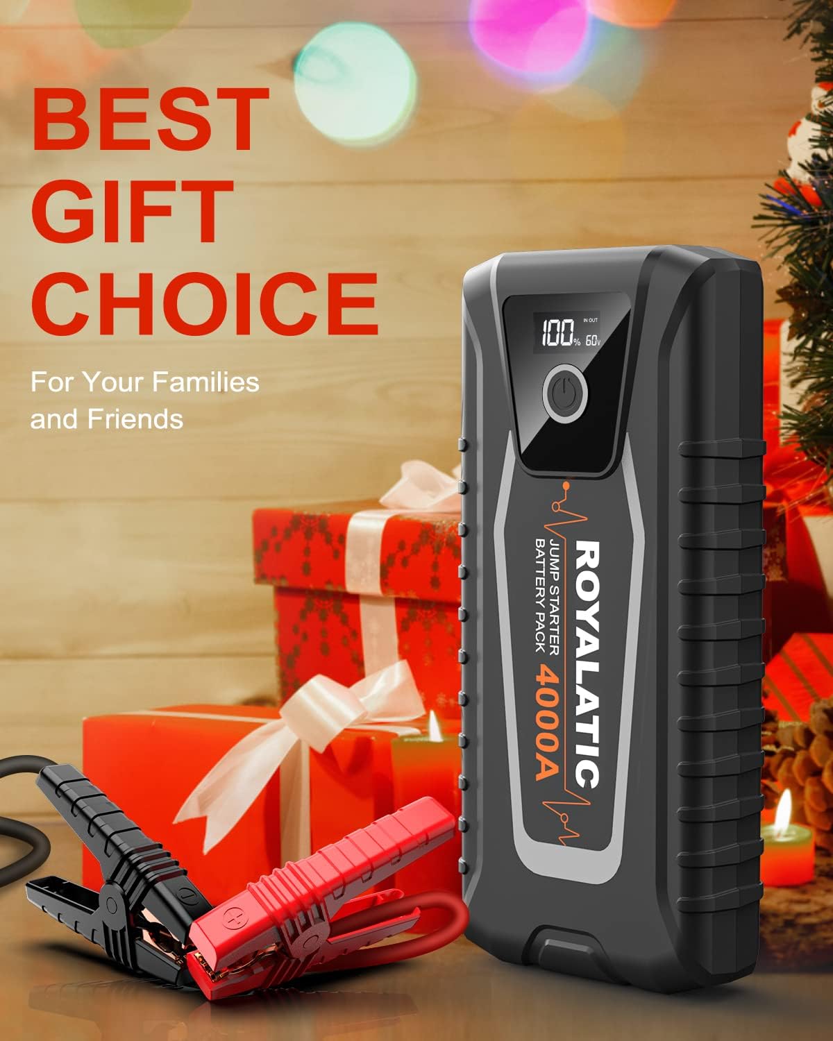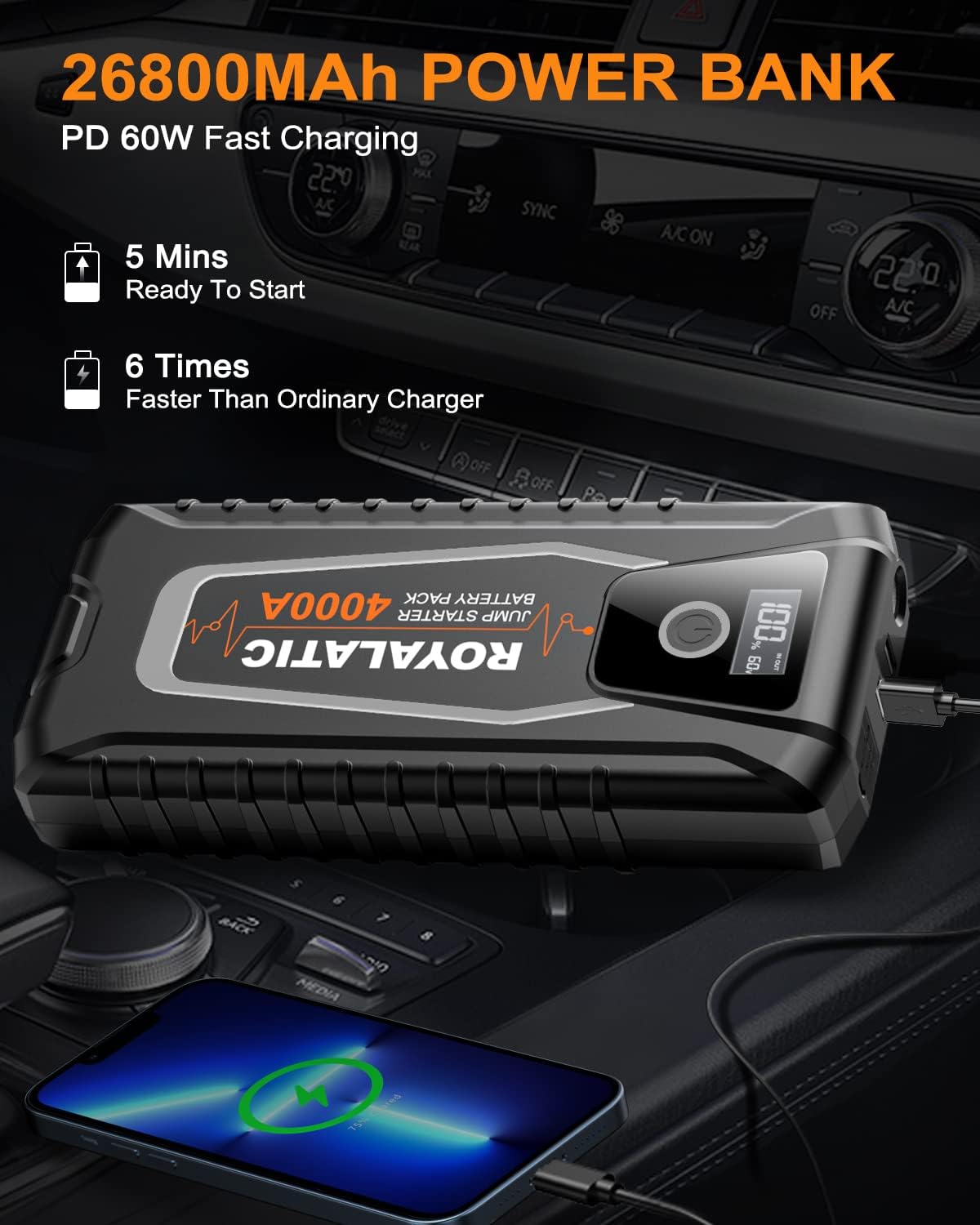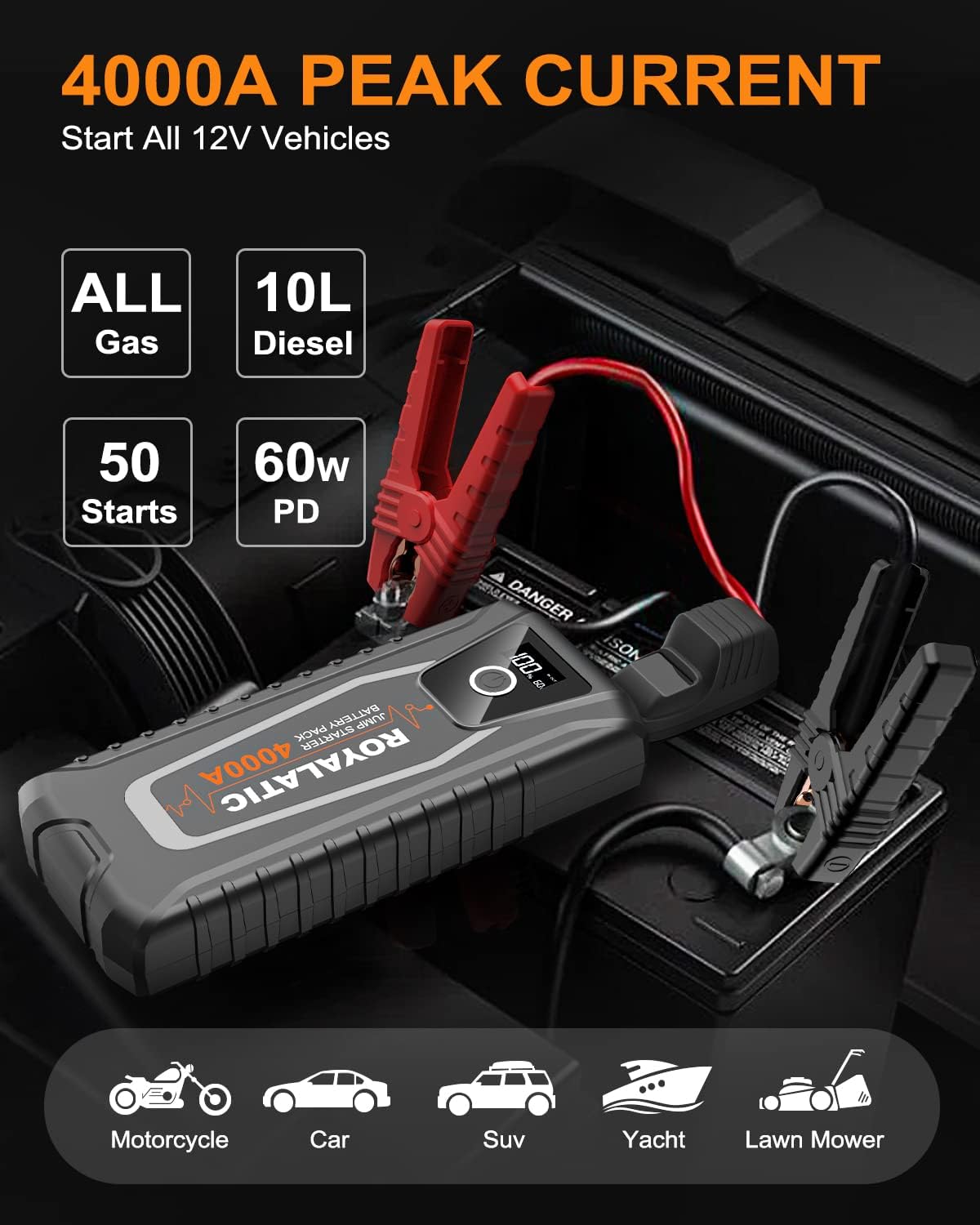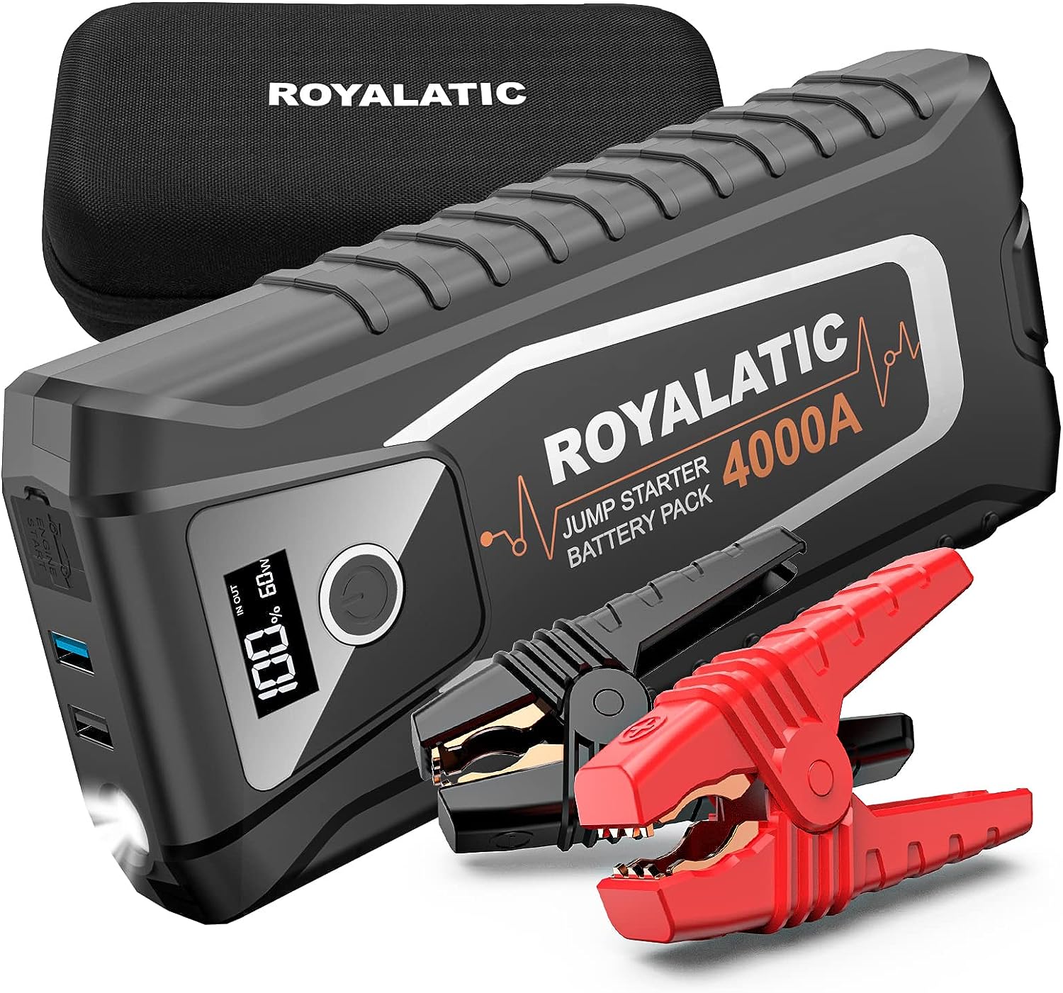 Jump Starter Battery Pack 4000A, 60W Two-Way Fast Charging, 12V Car Jump Starter Box, Royalatic 26800mAh Portable Car Battery Booster Pack with Jumper Cables, for All Gas or Up to 10L Diesel Engines