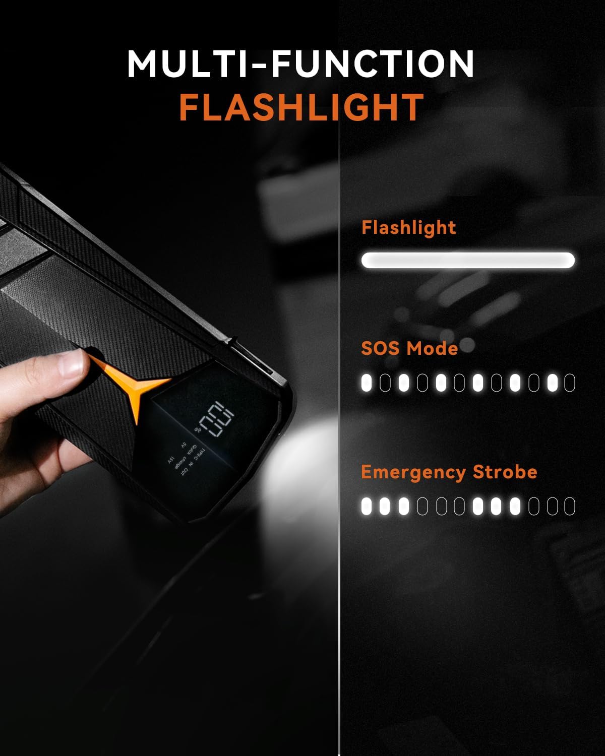 • 【Multi-Function】The specially designed indicator notifies you of incorrect use with an audible buzz and flashing lights. It also has a built-in LED flashlight with 3 modes: Flashlight, Strobe, SOS. The digital LCD screen clearly displays the remaining power. The 12V/10A DC port can power for other car products (cigarette lighter adapter is included).