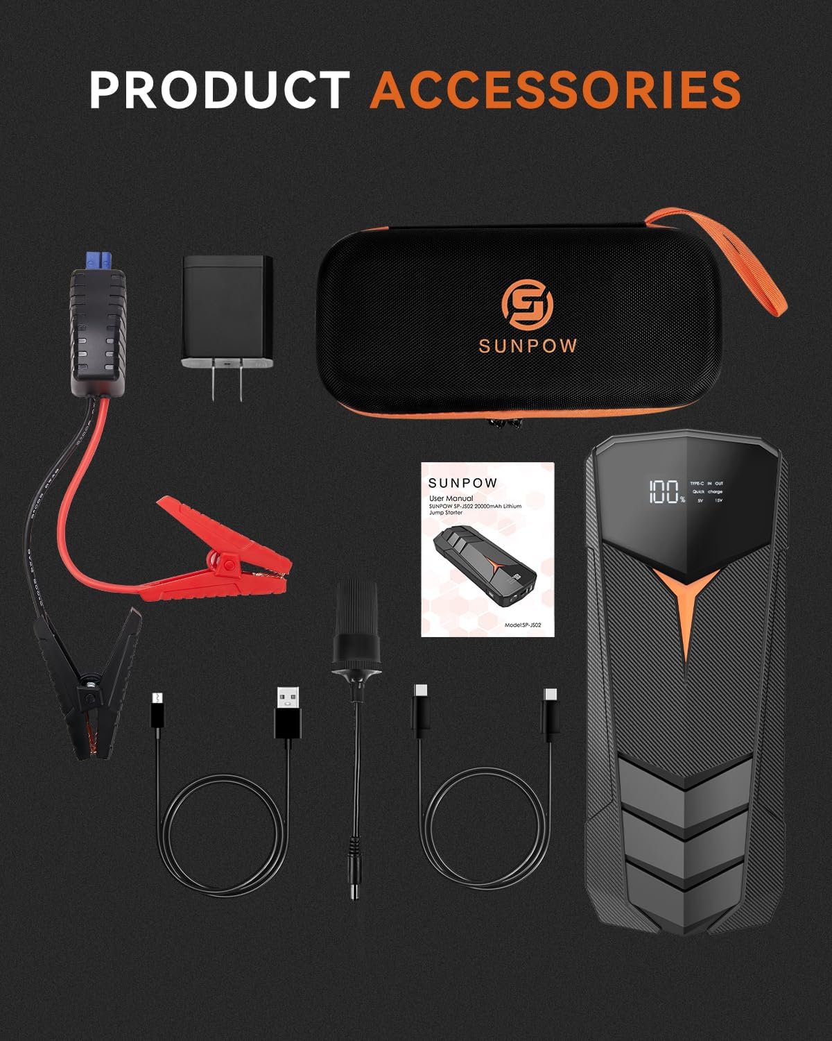 • 【Professional After-Sales Service】YOU WILL GET: 1* SUNPOW Lithium Jump Starter, 1*USB Charger, 1* Smart Jumper Cables, 1* Micro USB Cable, 1* Type-C Cable, 1*12V DC Cable, 1*User Guide. Any problems or questions, contact us at any time. We will help you solve it ASAP.