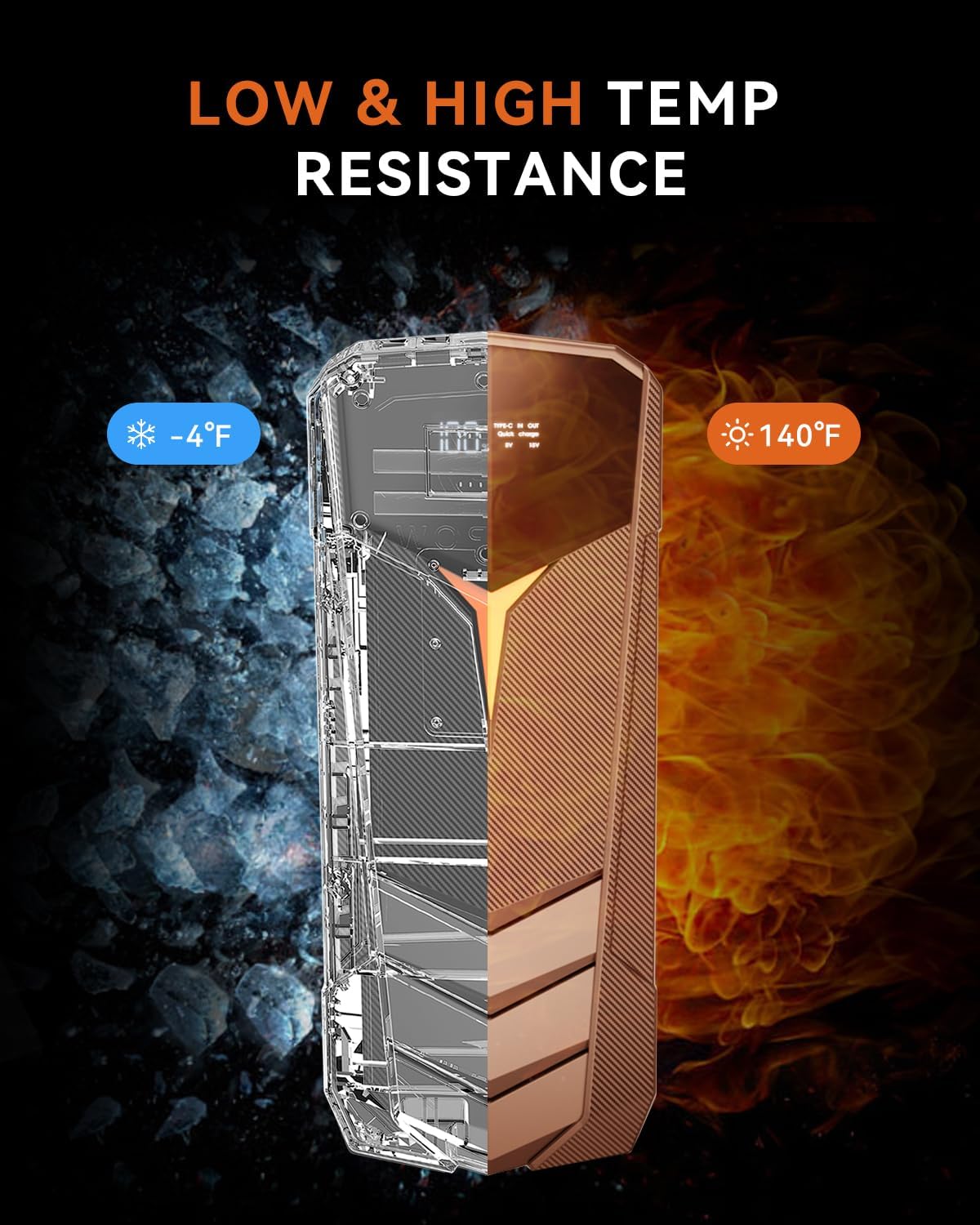 • 【Strong Protection】Advanced intelligent technology has spark proof protection, over charge protection, short circuit protection, over current protection, overload protection,over-voltage protection, reverse polarity protection, high temperature protection, low temperature protection etc. It can be started in extreme weather from -4℉~140℉.