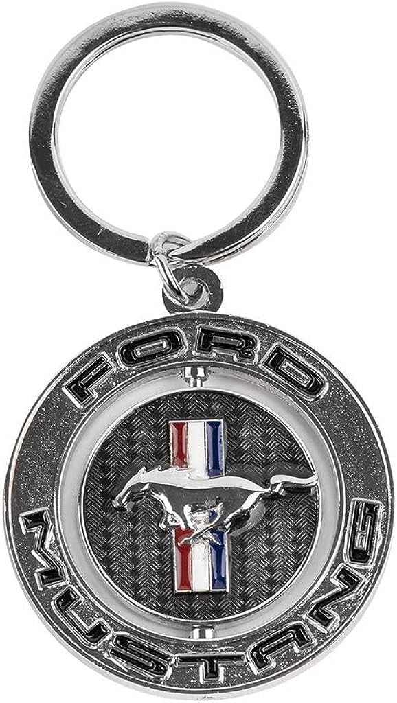 This heavy-duty keychain features an authentic Mustang emblem with a spinning center. Constructed with high-quality metal, it is officially licensed by Ford and includes a key ring that any Mustang owner must have.