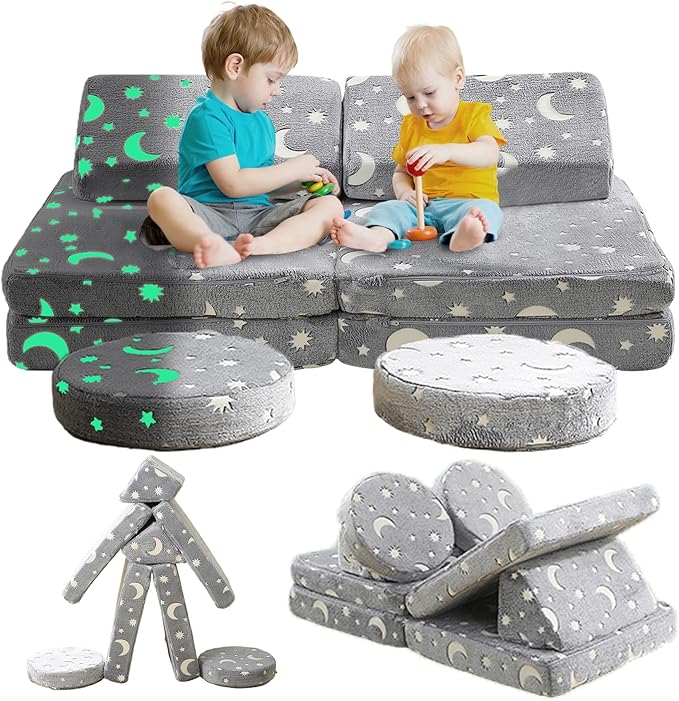 8PCS Modular Kids Play Couch, Toddler Couch Glow in The Dark Sofa for Playroom Bedroom, Play Couch for Girls Boys, Kids Convertible Sofa Sectional Foam Couch Set