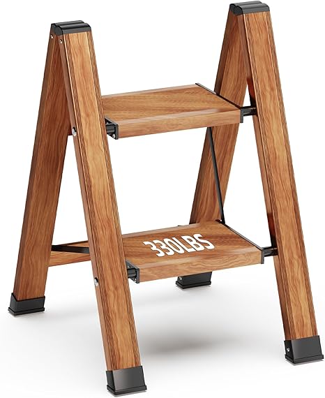 2 Step Ladder Folding Step Stool with Anti-Slip Sturdy and Wide Pedal, Lightweight 330lbs Portable Aluminum Woodgrain Shelf for Household and Kitchen Space Saving