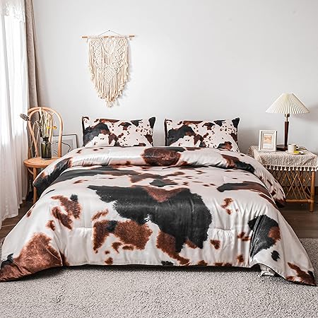 Aimuan Cow Print Bedding Set Satin Comforter Set Luxury Silk Like Satin Silky Cute Cozy Quilt Set Super Soft Microfiber Cartoon Sets with 2 Matching Pillow Covers (Brown, King)