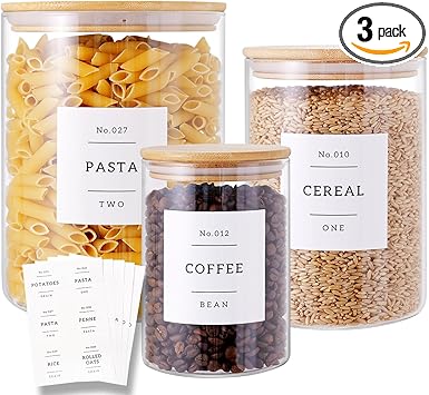 3 Pcs Glass Canisters with Airtight Bamboo Lids and 42 Kitchen Pantry Labels Preprinted - Clear Glass Flour and Sugar Storage Container Set - Large Glass Jars with Wood Lids(100 OZ/54 OZ/27 OZ)