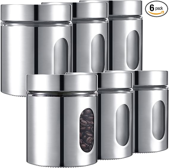 6 Pieces Kitchen Canisters Set 20 oz Stainless Steel Glass Canisters Airtight Coffee Sugar Tea Candy Jars Food Storage Container with Lid for Flour Cookies Spices Grains Kitchen Baking Home Decoration