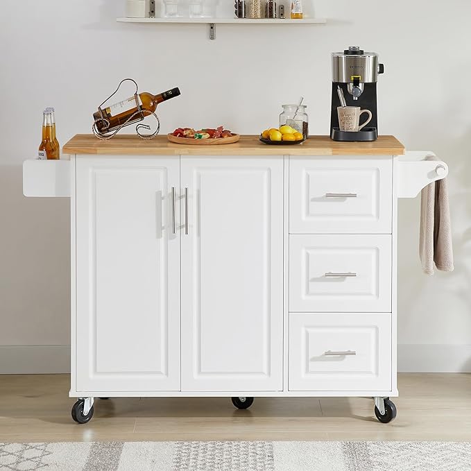 53.8" Kitchen Island Rolling Kitchen Island Cart with Storage on Wheels with Rubber Wood Drop Leaf Top Spice&Towel&Internal Storage Rack Adjustable Shelf 3 Drawers 5 Wheels for Kitchen, White