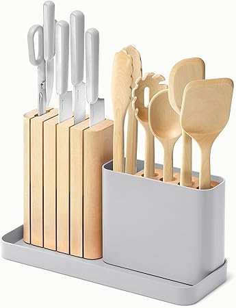 Caraway 14-Piece Kitchen Prep Set - Kitchen Knife Set & Wooden Utensil Set - Made With Premium German Steel Blades & FSC-Certified Birch Wood - Non-Toxic Materials - Includes Organizer - Grey