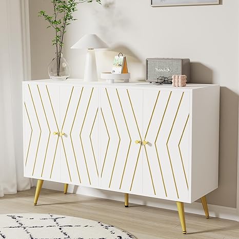 48" Sideboard Buffet Cabinet with Storage, White & Gold Lines Accent Storage Cabinet with 4 Doors, Modern Credenza for Living Room, Dining Room, Entryway, Hallway, Kitchen