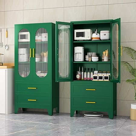 61.02_„�H Metal Pantry Storage Cabinet with Drawer, Pantries Cabinets with Acrylic Glass Doors and Adjustable Shelves, cupboard for Kitchen, Laundry Room, Living Room, Bathroom, Dinning Room, Tool Room