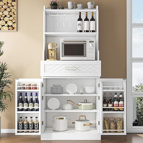 66" Pantry Cabinet with Adjustable Shelves and Drawer, Freestanding Microwave Stand Bakers Rack with Wine Glass Holder, Kitchen Pantry Storage Cabinet for Home Office Use (White)