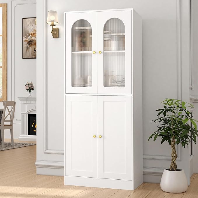 71" Tall Kitchen Pantry Cabinet, Kitchen Storage Cabinet with Glass Doors and Adjustable Shelves, Wood Food Pantry Cabinet, Freestanding Cupboard for Kitchen, Dining Room, White