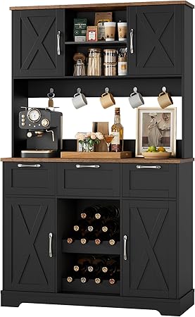 HIFIT 72" Large Kitchen Pantry Storage Cabinet with Barn Doors & Shelves, Farmhouse Tall Kitchen Hutch Wood Bar Cabinet w/3 Drawers, Microwave Stand, Cupboard Wine Rack for Kitchen Dining Room, Black