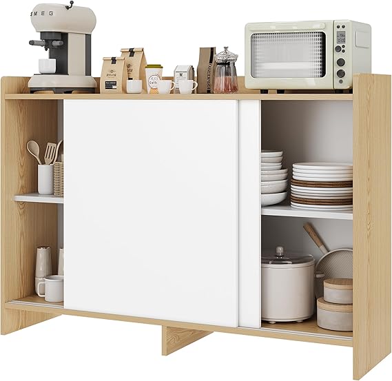 HIFIT Kitchen Buffet Sideboard Cabinet with Storage, 43" Farmhouse Modern Coffee Bar Storage Cabinet with Sliding Doors and Shelf, Narrow Cabinet for Dining Living Room Entryway Small Space, White-Oak