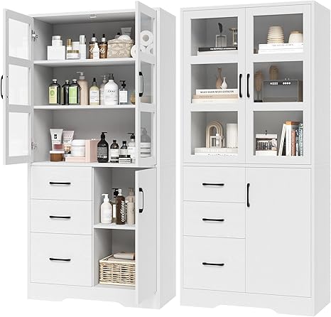 HIFIT Tall Bathroom Storage Cabinet, Modern Linen Cabinet with 2 Glass Display Doors & Shelves & Drawer, 67_„� Tall Cabinet Freestanding for Bathroom, Living Room, Laundry Room Kitchen Pantry White 1Pcs