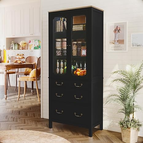 HLR 72" Kitchen Pantry Cabinet, Freestanding Tall Storage Cabinet, Utility Cupboard, Pantry Cabinet with Tempered Glass Doors and Adjustable Shelves for Kitchen, Living Room, Dining Room