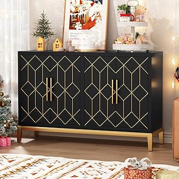 HLR Accent Cabinet with 4 Doors&Shelves, Sideboard Buffet Cabinet with Gold Trim, Modern Black Storage Cabinet for Living Room, Entryway, Kitchen, Dining Room, Hallway